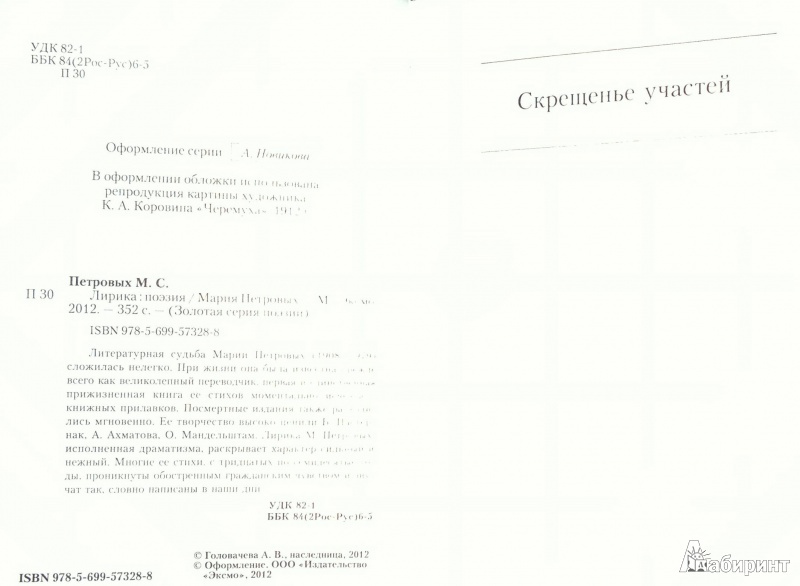 ОписаниеЛитературная судьба Марии Петровых (1908 - 1979) сложилась нелегко. При жизни она была известна прежде всего как великолепный переводчик, первая и единственная прижизненная книга ее стихов моментально исчезла с книжных прилавков. Посмертные издания также расходились мгновенно. Ее творчество высоко ценили Б. Пастернак, А. Ахматова, О. Мандельштам. Лирика М. Петровых, исполненная драматизма, раскрывает характер сильный и нежный. Многие ее стихи, с тридцатых по семидесятые годы, проникнуты обостренным гражданским чувством и звучат так, словно написаны в наши дни.Литературная судьба Марии Петровых (1908 - 1979) сложилась нелегко. При жизни она была известна прежде всего как великолепный переводчик, первая и единственная прижизненная книга ее стихов моментально исчезла с книжных прилавков. Посмертные издания также расходились мгновенно. Ее творчество высоко ценили Б. Пастернак, А. Ахматова, О. Мандельштам. Лирика М. Петровых, исполненная драматизма, раскрывает характер сильный и нежный. Многие ее стихи, с тридцатых по семидесятые годы, проникнуты обостренным гражданским чувством и звучат так, словно написаны в наши дни.