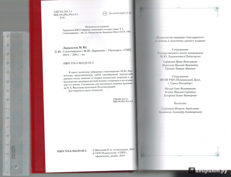 Объем, стр. 208 ISBN 978-5-903129-55-3 Автор Лермонтов Михаил Юрьевич, Васильева Надежда Вениаминовна Художник Васильева Надежда Вениаминовна Язык Русский Минимальный возраст 12+ Год издания книги 2021 Тип обложки Твердый переплет Иллюстрации Черно-белые + цветные Вес, г 260г Размеры 198х115х15 мм - Отзывы