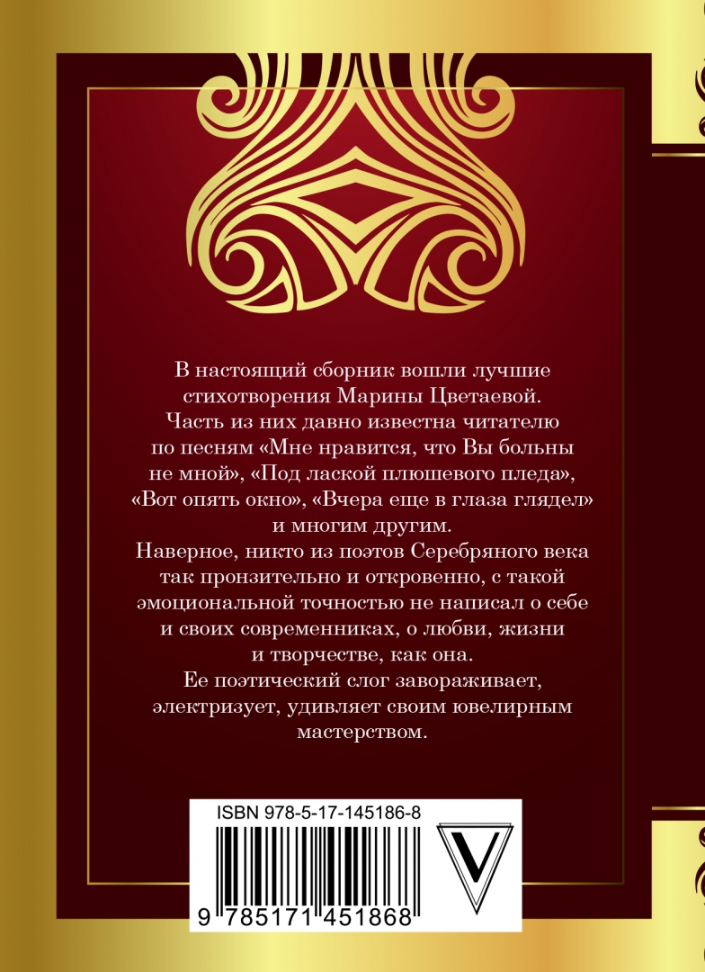 ОписаниеВ настоящий сборник вошли лучшие стихотворения Марины Цветаевой. Часть из них давно известна читателю по песням "Мне нравится, что Вы больны не мной", "Под лаской плюшевого пледа", "Вот опять окно", "Вчера еще в глаза глядел" и многим другим. Наверное, никто из поэтов Серебряного века так пронзительно и откровенно, с такой эмоциональной точностью не написал о себе и своих современниках, о любви, жизни и творчестве, как она. Ее поэтический слог завораживает, электризует, удивляет своим ювелирным мастерством.В настоящий сборник вошли лучшие стихотворения Марины Цветаевой. Часть из них давно известна читателю по песням "Мне нравится, что Вы больны не мной", "Под лаской плюшевого пледа", "Вот опять окно", "Вчера еще в глаза глядел" и многим другим. Наверное, никто из поэтов Серебряного века так пронзительно и откровенно, с такой эмоциональной точностью не написал о себе и своих современниках, о любви, жизни и творчестве, как она. Ее поэтический слог завораживает, электризует, удивляет своим ювелирным мастерством.