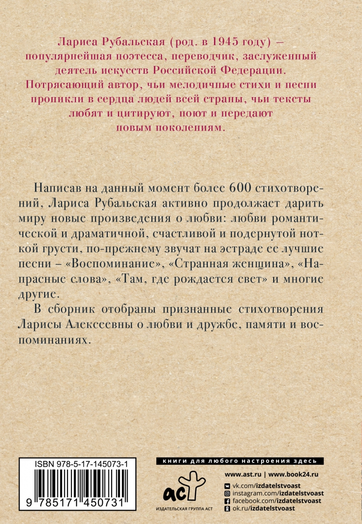 ОписаниеЛариса Рубальская (род. в 1945 году) – популярнейшая поэтесса, переводчик, заслуженный деятель искусств Российской Федерации. Потрясающий автор, чьи мелодичные стихи и песни проникли в сердца людей всей страны, чьи тексты любят и цитируют, поют и передают новым поколениям. Написав на данный момент более 600 стихотворений, Лариса Рубальская активно продолжает дарить миру новые произведения о любви: любви романтической и драматичной, счастливой и подернутой ноткой грусти, по-прежнему звучат на эстраде ее лучшие песни – «Воспоминание», «Странная женщина», «Напрасные слова», «Там, где рождается свет» и многие другие. В сборник отобраны признанные стихотворения Ларисы Алексеевны о любви и дружбе, памяти и воспоминаниях.Лариса Рубальская (род. в 1945 году) – популярнейшая поэтесса, переводчик, заслуженный деятель искусств Российской Федерации. Потрясающий автор, чьи мелодичные стихи и песни проникли в сердца людей всей страны, чьи тексты любят и цитируют, поют и передают новым поколениям. Написав на данный момент более 600 стихотворений, Лариса Рубальская активно продолжает дарить миру новые произведения о любви: любви романтической и драматичной, счастливой и подернутой ноткой грусти, по-прежнему звучат на эстраде ее лучшие песни – «Воспоминание», «Странная женщина», «Напрасные слова», «Там, где рождается свет» и многие другие. В сборник отобраны признанные стихотворения Ларисы Алексеевны о любви и дружбе, памяти и воспоминаниях.