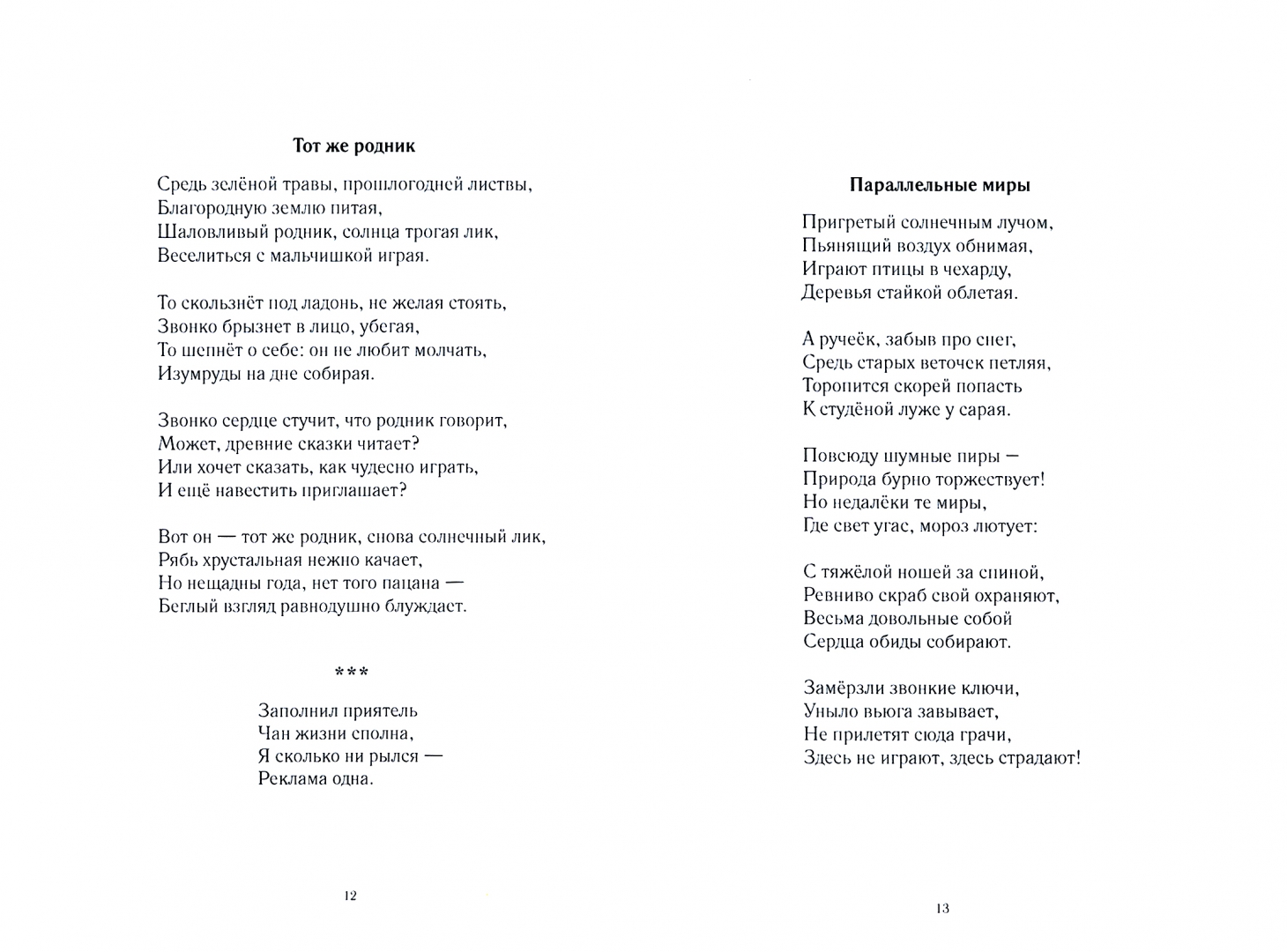 ОписаниеЧто есть жизнь? Куда идёт человек и ради чего он живёт? В суете дней мы не так часто задумываемся над этими вопросами. Поэзия же, как всегда, трогает самые тайные струны души и заставляет заглянуть в самого себя. Стихи, собранные в сборнике, не являются исключением. Ёмкие и в то же время лаконичные, они легко и непринуждённо раскрывают читателю то, что в жизни, порой, кажется сложным и неразрешимым. Особенно примечательны стихотворения малой формы. Содержательные и глубокие, а подчас ироничные и даже саркастичные, они, несмотря на свою краткость, поразят читателя богатством мыслей, неожиданными ассоциациями и яркими образами.Что есть жизнь? Куда идёт человек и ради чего он живёт? В суете дней мы не так часто задумываемся над этими вопросами. Поэзия же, как всегда, трогает самые тайные струны души и заставляет заглянуть в самого себя. Стихи, собранные в сборнике, не являются исключением. Ёмкие и в то же время лаконичные, они легко и непринуждённо раскрывают читателю то, что в жизни, порой, кажется сложным и неразрешимым. Особенно примечательны стихотворения малой формы. Содержательные и глубокие, а подчас ироничные и даже саркастичные, они, несмотря на свою краткость, поразят читателя богатством мыслей, неожиданными ассоциациями и яркими образами.
