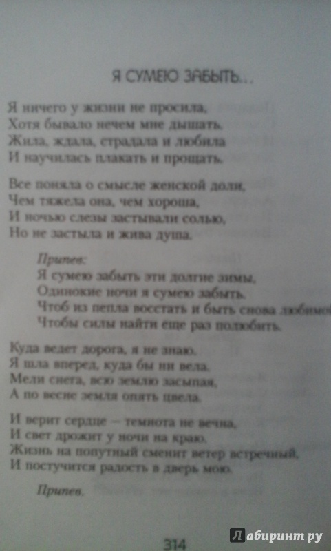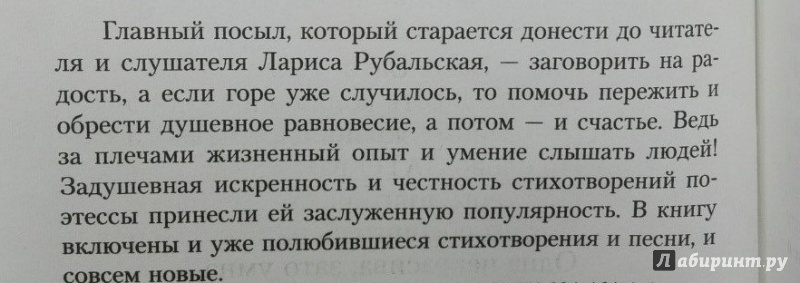 ОписаниеГлавный посыл, который старается донести до читателя и слушателя Лариса Рубальская, - заговорить на радость, а если горе уже случилось, то помочь пережить и обрести душевное равновесие, а потом - и счастье. Ведь за плечами жизненный опыт и умение слышать людей! Задушевная искренность и честность стихотворений поэтессы принесли ей заслуженную популярность. В книгу включены и уже полюбившиеся стихотворения и песни, и совсем новые.Главный посыл, который старается донести до читателя и слушателя Лариса Рубальская, - заговорить на радость, а если горе уже случилось, то помочь пережить и обрести душевное равновесие, а потом - и счастье. Ведь за плечами жизненный опыт и умение слышать людей! Задушевная искренность и честность стихотворений поэтессы принесли ей заслуженную популярность. В книгу включены и уже полюбившиеся стихотворения и песни, и совсем новые.