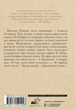ОписаниеНиколай Рубцов - выдающийся поэт второй половины ХХ века, провидец собственной судьбы, оставивший яркий след в русской поэзии. "Стихи сильны и долговечны тогда, когда они идут через личное, через частное, но при этом нужна масштабность и жизненная характерность настроений, переживаний, размышлений…" (Н. Рубцов) Николая Рубцова часто сравнивают с Сергеем Есениным. В их поэзии и жизни можно найти много общего. Но Рубцов не подражал любимому поэту, он шел своим путем, не менее ярким, но более скромным и тихим. Искренность, задушевность, проникновение во все уголки человеческой души, сопереживание ближнему, умение любить, верить, быть счастливым и радоваться даже малому сделали лирику Н. Рубцова необычайно близкой людям. Недаром на его стихи написано так много песен - и бардовских, и эстрадных: "Я буду долго гнать велосипед…", "В горнице моей светло", "Звезда полей", "Деревенские ночи"… В настоящий сборник вошли самые знаменитые стихотворения Николая Рубцова.Николай Рубцов - выдающийся поэт второй половины ХХ века, провидец собственной судьбы, оставивший яркий след в русской поэзии. "Стихи сильны и долговечны тогда, когда они идут через личное, через частное, но при этом нужна масштабность и жизненная характерность настроений, переживаний, размышлений…" (Н. Рубцов) Николая Рубцова часто сравнивают с Сергеем Есениным. В их поэзии и жизни можно найти много общего. Но Рубцов не подражал любимому поэту, он шел своим путем, не менее ярким, но более скромным и тихим. Искренность, задушевность, проникновение во все уголки человеческой души, сопереживание ближнему, умение любить, верить, быть счастливым и радоваться даже малому сделали лирику Н. Рубцова необычайно близкой людям. Недаром на его стихи написано так много песен - и бардовских, и эстрадных: "Я буду долго гнать велосипед…", "В горнице моей светло", "Звезда полей", "Деревенские ночи"… В настоящий сборник вошли самые знаменитые стихотворения Николая Рубцова.