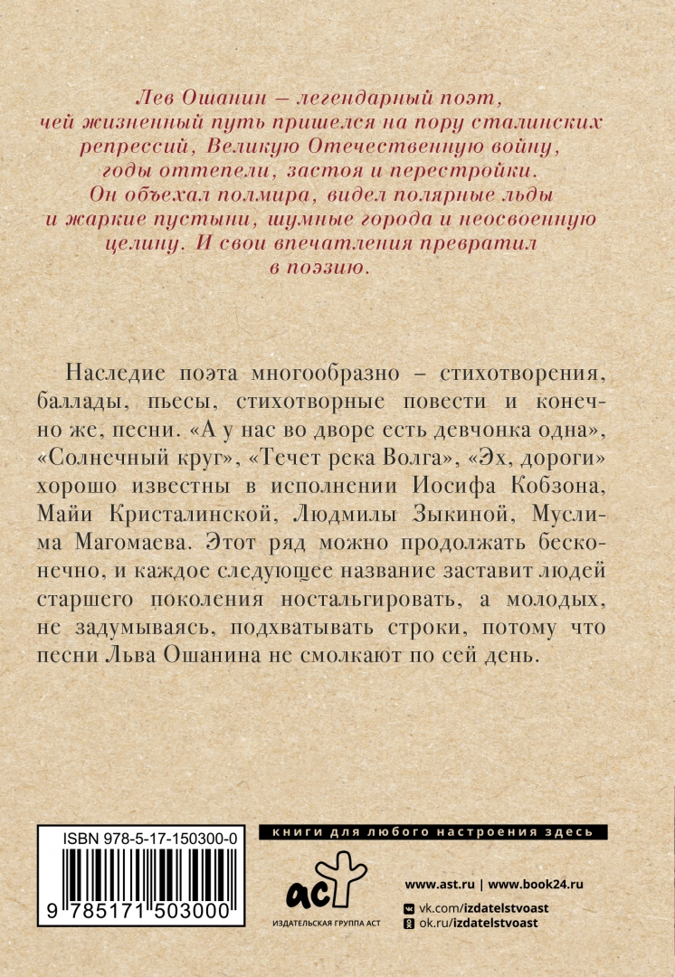 ОписаниеЛев Ошанин – легендарный поэт, чей жизненный путь пришелся на пору сталинских репрессий, Великую Отечественную войну, годы оттепели, застоя и перестройки. Он объехал полмира, видел полярные льды и жаркие пустыни, шумные города и неосвоенную целину. И свои впечатления превратил в поэзию. Наследие поэта многообразно – стихотворения, баллады, пьесы, стихотворные повести и конечно же, песни. «А у нас во дворе есть девчонка одна», «Солнечный круг», «Течет река Волга», «Эх, дороги» хорошо известны в исполнении Иосифа Кобзона, Майи Кристалинской, Людмилы Зыкиной, Муслима Магомаева. Этот ряд можно продолжать бесконечно, и каждое следующее название заставит людей старшего поколения ностальгировать, а молодых, не задумываясь, подхватывать строки, потому что песни Льва Ошанина не смолкают по сей день.Лев Ошанин – легендарный поэт, чей жизненный путь пришелся на пору сталинских репрессий, Великую Отечественную войну, годы оттепели, застоя и перестройки. Он объехал полмира, видел полярные льды и жаркие пустыни, шумные города и неосвоенную целину. И свои впечатления превратил в поэзию. Наследие поэта многообразно – стихотворения, баллады, пьесы, стихотворные повести и конечно же, песни. «А у нас во дворе есть девчонка одна», «Солнечный круг», «Течет река Волга», «Эх, дороги» хорошо известны в исполнении Иосифа Кобзона, Майи Кристалинской, Людмилы Зыкиной, Муслима Магомаева. Этот ряд можно продолжать бесконечно, и каждое следующее название заставит людей старшего поколения ностальгировать, а молодых, не задумываясь, подхватывать строки, потому что песни Льва Ошанина не смолкают по сей день.