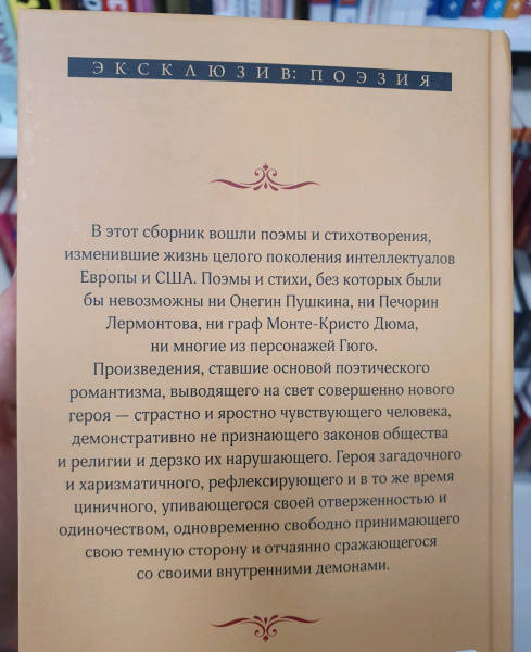 ОписаниеВ этот сборник вошли поэмы и стихотворения, изменившие жизнь целого поколения интеллектуалов Европы и США. Поэмы и стихи, без которых были бы невозможны ни Онегин Пушкина, ни Печорин Лермонтова, ни граф Монте-Кристо Дюма, ни многие из персонажей Гюго.Произведения, ставшие основой поэтического романтизма, выводящего на свет совершенно нового героя - страстно и яростно чувствующего человека, демонстративно не признающего законов общества и религии и дерзко их нарушающего. Героя загадочного и харизматичного, рефлексирующего и в то же время циничного, упивающегося своей отверженностью и одиночеством, одновременно свободно принимающего свою темную сторону и отчаянно сражающегося со своими внутренними демонами.В этот сборник вошли поэмы и стихотворения, изменившие жизнь целого поколения интеллектуалов Европы и США. Поэмы и стихи, без которых были бы невозможны ни Онегин Пушкина, ни Печорин Лермонтова, ни граф Монте-Кристо Дюма, ни многие из персонажей Гюго.Произведения, ставшие основой поэтического романтизма, выводящего на свет совершенно нового героя - страстно и яростно чувствующего человека, демонстративно не признающего законов общества и религии и дерзко их нарушающего. Героя загадочного и харизматичного, рефлексирующего и в то же время циничного, упивающегося своей отверженностью и одиночеством, одновременно свободно принимающего свою темную сторону и отчаянно сражающегося со своими внутренними демонами.