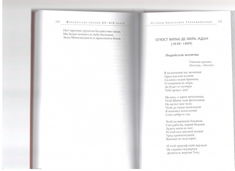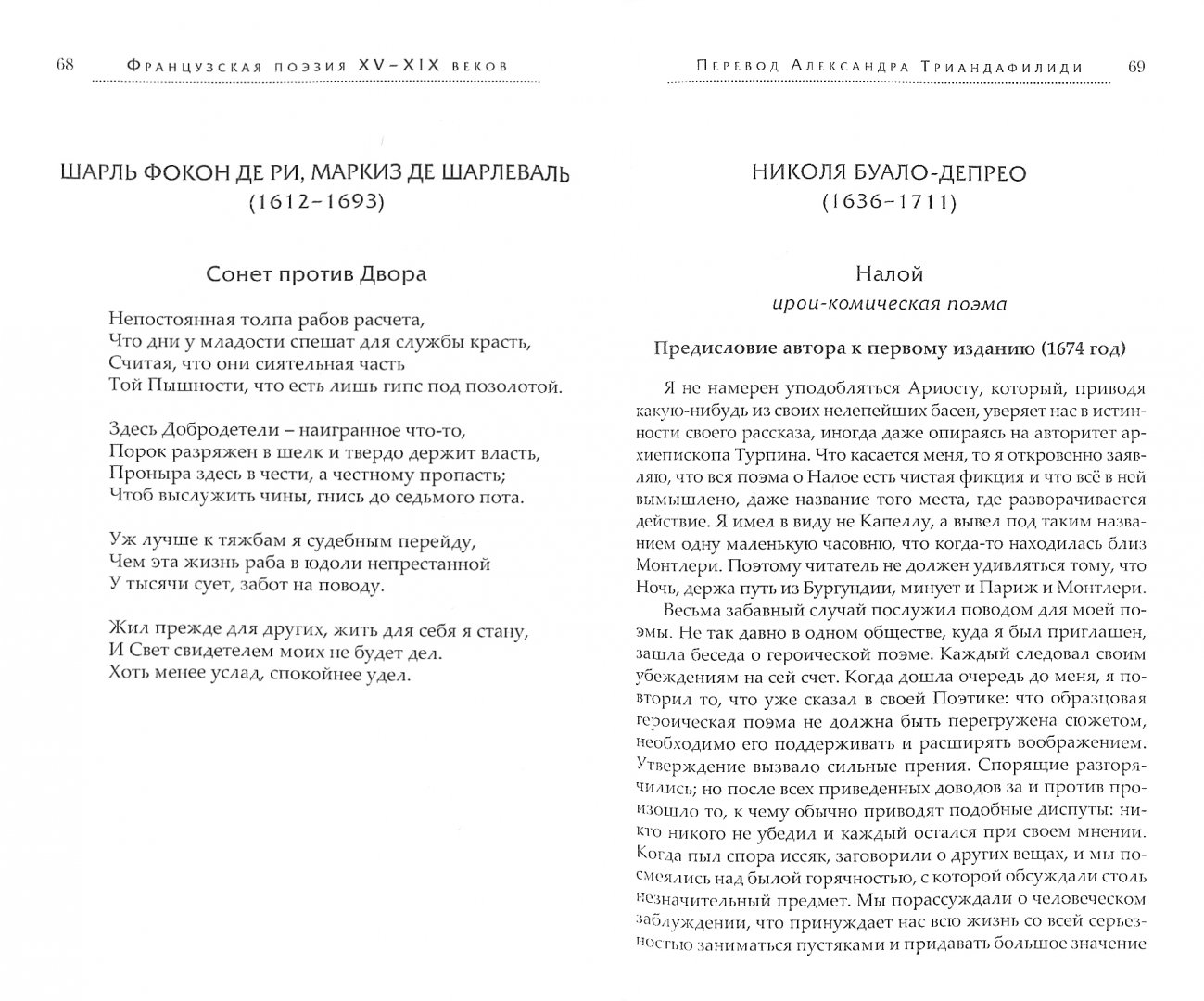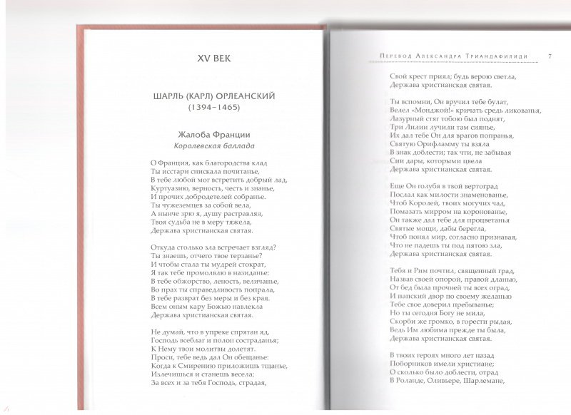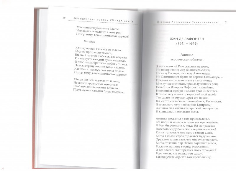 ОписаниеЭта книга не только открывает русскому читателю имена незаслуженно забытых поэтов, но и расширяет наше представление о творчестве признанных классиков. В частности, в нее вошли не переводившиеся ранее "Жалоба Франции" Шарля Орлеанского, мифологическая поэма Лафонтена "Адонис", стихи Гюго, Верлена, Роллина и др. В центре книги комическая поэма Николя Буало "Налой" - остроумная сатира на католическое духовенство, оказавшая значительное влияние на русскую литературу XVIII - начала XIX в., но ни разу не издававшаяся в нашей стране. Александр Триандафилиди (р. 1981), участник семинара Е.В. Витковского "Век перевода", известен прежде всего своими монументальными работами (романы Кретьена де Труа в соавторстве с Н.В. Забабуровой, "Неистовый Роланд" Ариосто, "Аркадия" Саннадзаро). В книге собраны лучшие его работы с французского в области малых форм.Эта книга не только открывает русскому читателю имена незаслуженно забытых поэтов, но и расширяет наше представление о творчестве признанных классиков. В частности, в нее вошли не переводившиеся ранее "Жалоба Франции" Шарля Орлеанского, мифологическая поэма Лафонтена "Адонис", стихи Гюго, Верлена, Роллина и др. В центре книги комическая поэма Николя Буало "Налой" - остроумная сатира на католическое духовенство, оказавшая значительное влияние на русскую литературу XVIII - начала XIX в., но ни разу не издававшаяся в нашей стране. Александр Триандафилиди (р. 1981), участник семинара Е.В. Витковского "Век перевода", известен прежде всего своими монументальными работами (романы Кретьена де Труа в соавторстве с Н.В. Забабуровой, "Неистовый Роланд" Ариосто, "Аркадия" Саннадзаро). В книге собраны лучшие его работы с французского в области малых форм.