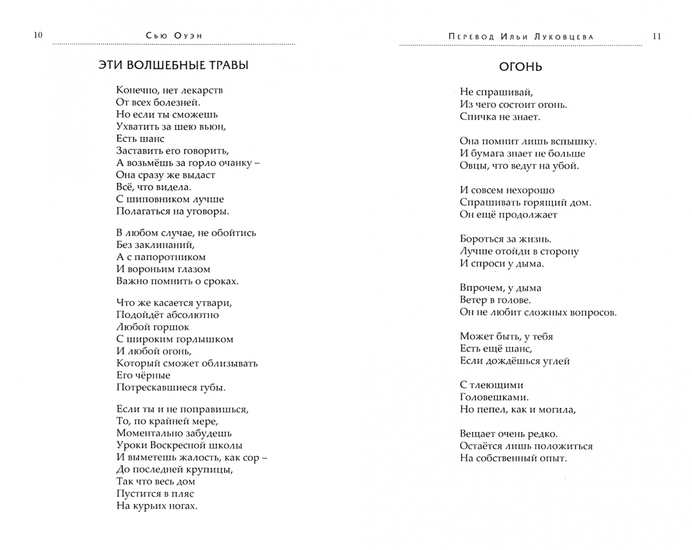ОписаниеСью Оуэн (р. 1942) - современная американская поэтесса, одна из ярких представителей "поэзии глубокого образа" наряду с Ч. Симиком, М. Стрэндом и У. С. Мервином. Это направление, возникшее в 1960-е годы в США, во многом восходит к поэтике французского и испанского сюрреализма. В поэзии С. Оуэн органично сочетаются лаконичная простота с изысканностью образов, черный юмор с глубоким серьезным подтекстом. Книга представляет собой почти полное собрание стихотворений автора. Все они переведены Ильей Луковцевым на русский язык впервые.Сью Оуэн (р. 1942) - современная американская поэтесса, одна из ярких представителей "поэзии глубокого образа" наряду с Ч. Симиком, М. Стрэндом и У. С. Мервином. Это направление, возникшее в 1960-е годы в США, во многом восходит к поэтике французского и испанского сюрреализма. В поэзии С. Оуэн органично сочетаются лаконичная простота с изысканностью образов, черный юмор с глубоким серьезным подтекстом. Книга представляет собой почти полное собрание стихотворений автора. Все они переведены Ильей Луковцевым на русский язык впервые.