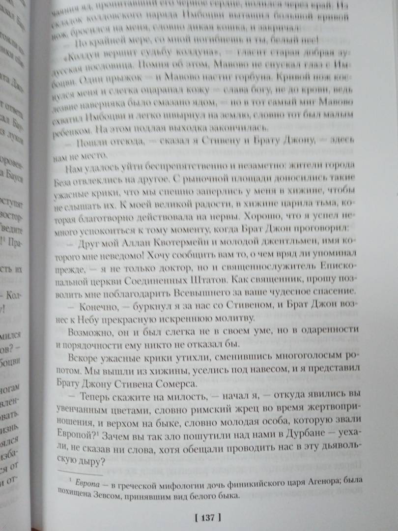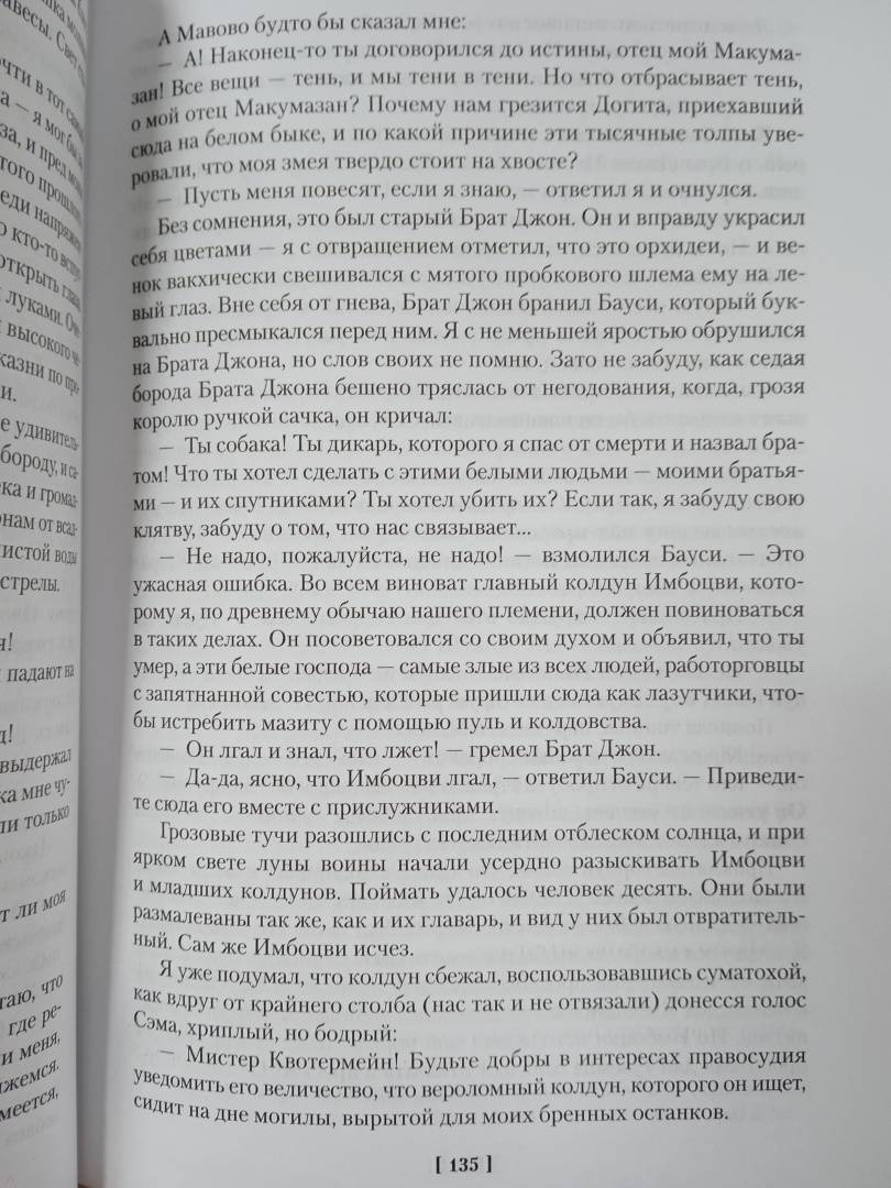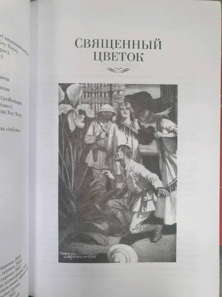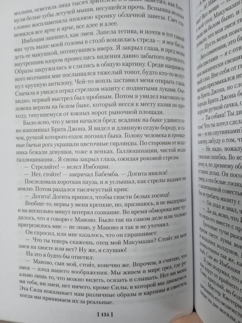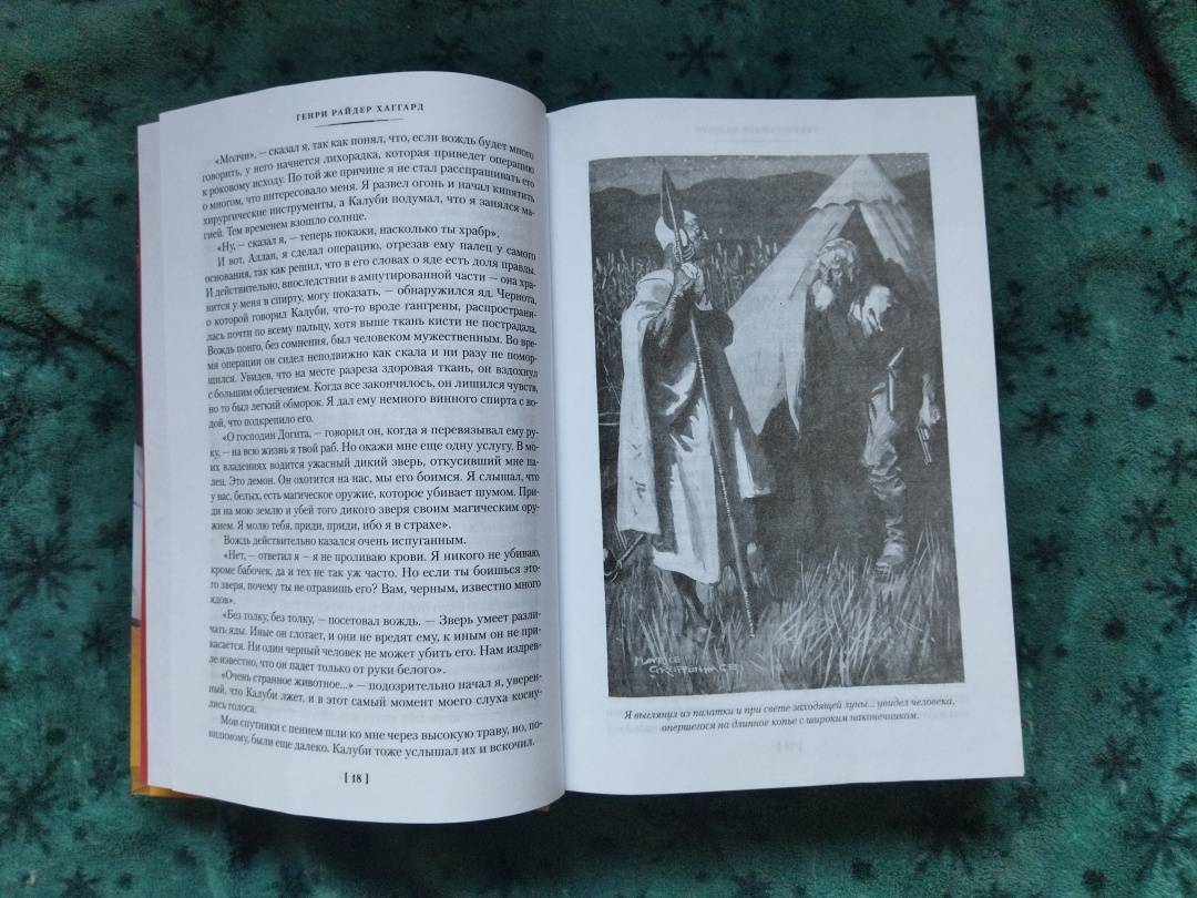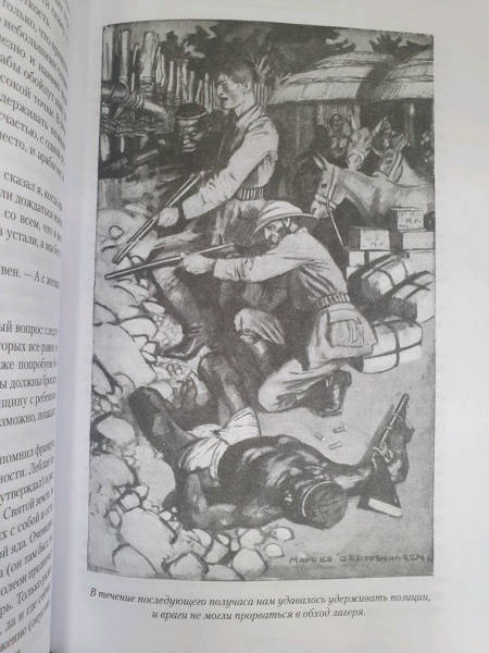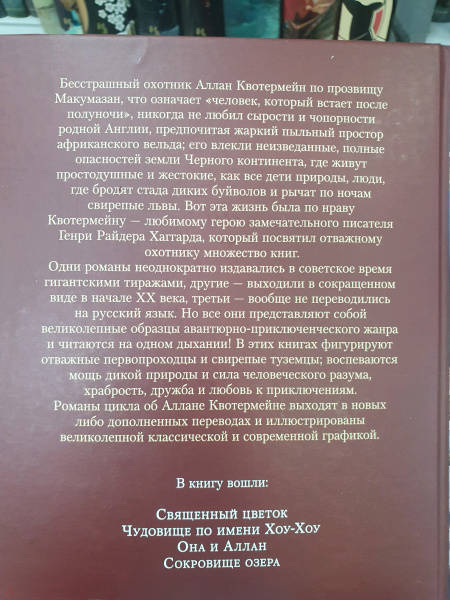 ОписаниеБесстрашный охотник Аллан Квотермейн по прозвищу Макумазан, что означает "человек, который встает после полуночи", никогда не любил сырости и чопорности родной Англии, предпочитая жаркий пыльный простор африканского вельда; его влекли неизведанные, полные опасностей земли Черного континента, где живут простодушные и жестокие, как все дети природы, люди, где бродят стада диких буйволов и рычат по ночам свирепые львы. Вот эта жизнь была по нраву Квотермейну - любимому герою замечательного писателя Генри Райдера Хаггарда (1856-1925), который посвятил отважному охотнику множество книг. Цикл приключений Аллана Квотермейна продолжают "Священный цветок", "Чудовище по имени Хоу-Хоу", "Она и Аллан" (роман выходит в новом переводе), "Сокровище озера". Эти произведения печатаются с сохранением примечаний английских издателей. Книга иллюстрирована классическими рисунками Мориса Грайфенхагена и замечательной графикой Елены Шипицыной.Бесстрашный охотник Аллан Квотермейн по прозвищу Макумазан, что означает "человек, который встает после полуночи", никогда не любил сырости и чопорности родной Англии, предпочитая жаркий пыльный простор африканского вельда; его влекли неизведанные, полные опасностей земли Черного континента, где живут простодушные и жестокие, как все дети природы, люди, где бродят стада диких буйволов и рычат по ночам свирепые львы. Вот эта жизнь была по нраву Квотермейну - любимому герою замечательного писателя Генри Райдера Хаггарда (1856-1925), который посвятил отважному охотнику множество книг. Цикл приключений Аллана Квотермейна продолжают "Священный цветок", "Чудовище по имени Хоу-Хоу", "Она и Аллан" (роман выходит в новом переводе), "Сокровище озера". Эти произведения печатаются с сохранением примечаний английских издателей. Книга иллюстрирована классическими рисунками Мориса Грайфенхагена и замечательной графикой Елены Шипицыной.