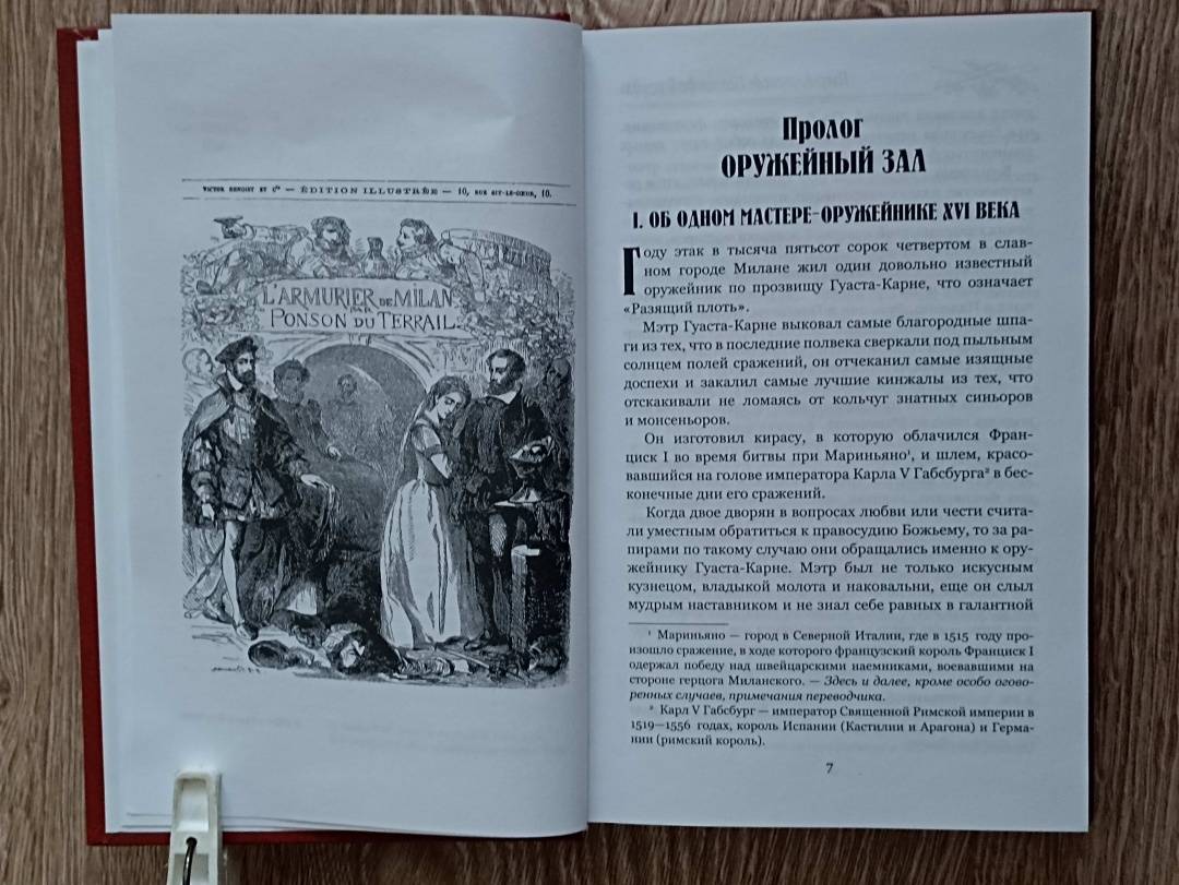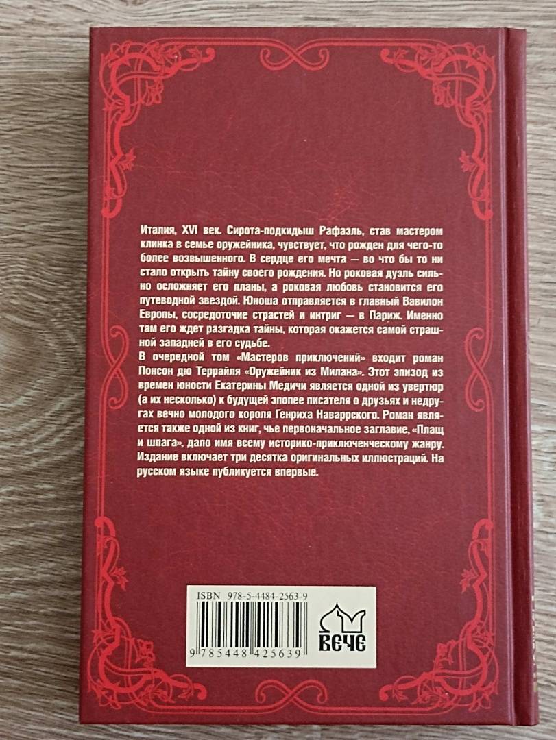 ОписаниеИталия, XVI век. Сирота-подкидыш Рафаэль, став мастером клинка в семье оружейника, чувствует, что рожден для чего-то более возвышенного. В сердце его мечта - во что бы то ни стало открыть тайну своего рождения. Но роковая дуэль сильно осложняет его планы, а роковая любовь становится его путеводной звездой. Юноша отправляется в главный Вавилон Европы, сосредоточие страстей и интриг - в Париж. Именно там его ждет разгадка тайны, которая окажется самой страшной западней в его судьбе.В очередной том "Мастеров приключений" входит роман Понсон дю Террайля "Оружейник из Милана". Этот эпизод из времен юности Екатерины Медичи является одной из увертюр (а их несколько) к будущей эпопее писателя о друзьях и недругах вечно молодого короля Генриха Наваррского. Роман является также одной из книг, чье первоначальное заглавие, "Плащ и шпага", дало имя всему историко-приключенческому жанру. Издание включает три десятка оригинальных иллюстраций. На русском языке публикуется впервые.Италия, XVI век. Сирота-подкидыш Рафаэль, став мастером клинка в семье оружейника, чувствует, что рожден для чего-то более возвышенного. В сердце его мечта - во что бы то ни стало открыть тайну своего рождения. Но роковая дуэль сильно осложняет его планы, а роковая любовь становится его путеводной звездой. Юноша отправляется в главный Вавилон Европы, сосредоточие страстей и интриг - в Париж. Именно там его ждет разгадка тайны, которая окажется самой страшной западней в его судьбе.В очередной том "Мастеров приключений" входит роман Понсон дю Террайля "Оружейник из Милана". Этот эпизод из времен юности Екатерины Медичи является одной из увертюр (а их несколько) к будущей эпопее писателя о друзьях и недругах вечно молодого короля Генриха Наваррского. Роман является также одной из книг, чье первоначальное заглавие, "Плащ и шпага", дало имя всему историко-приключенческому жанру. Издание включает три десятка оригинальных иллюстраций. На русском языке публикуется впервые.