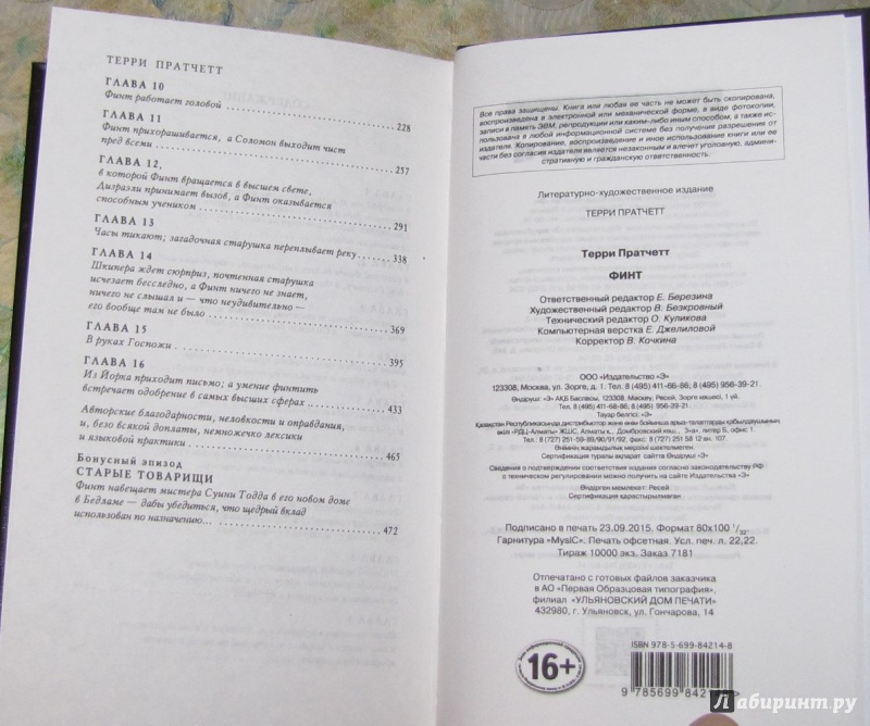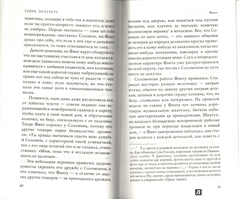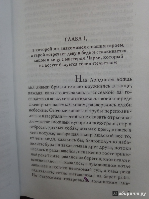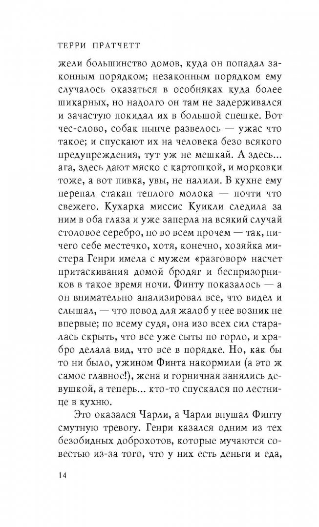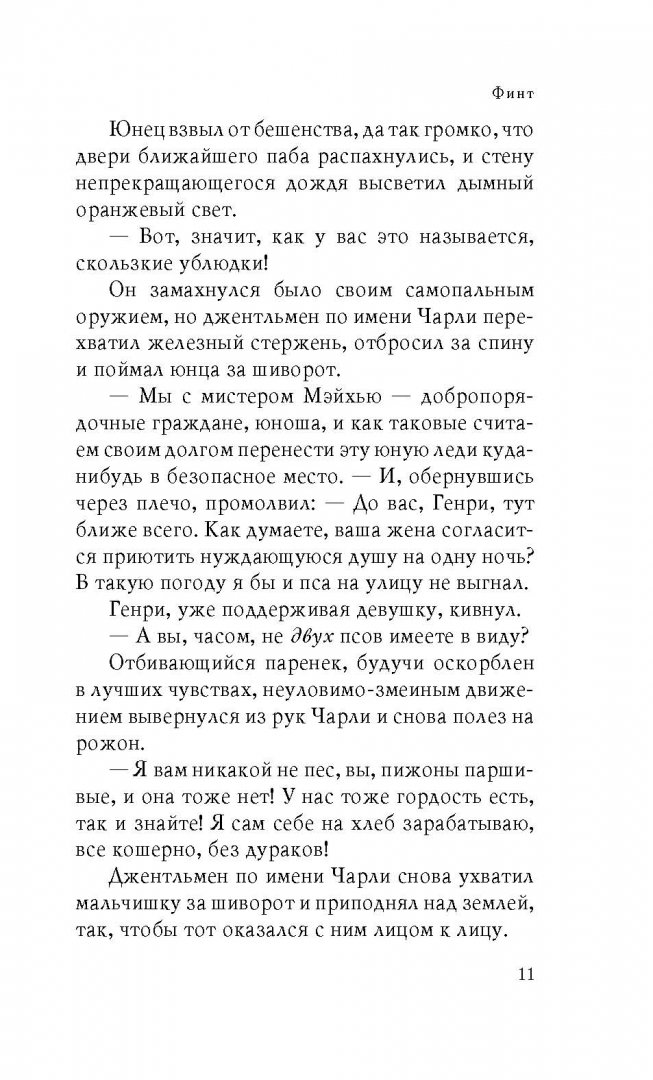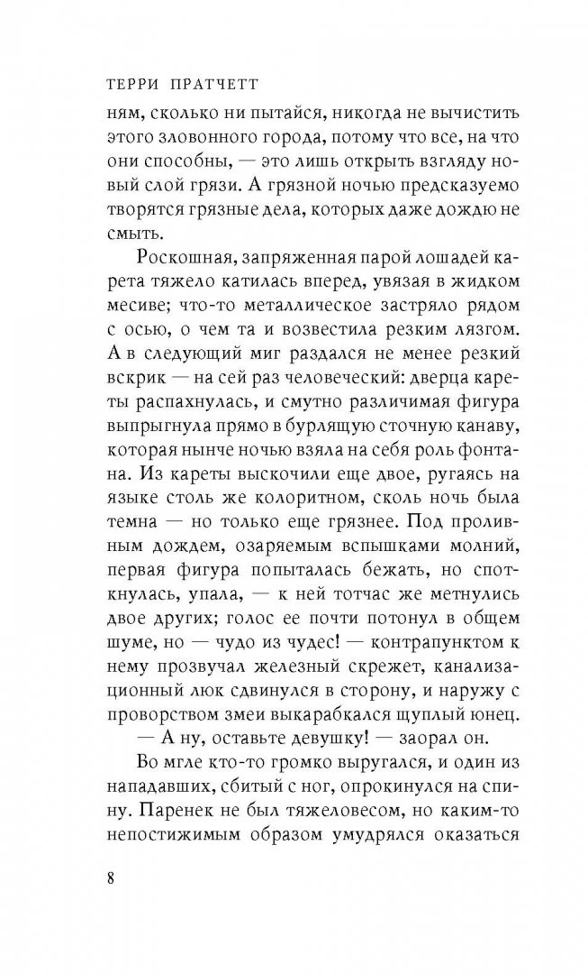 ОписаниеНовинка от создателя "Плоского мира"!Лондон, викторианская Англия.Семнадцатилетний Финт рыщет в городской канализации в поисках утерянных сокровищ. Малопочтенное занятие, как ни крути, однако ж и не воровство…Однажды в темную грозовую ночь Финт спасает юную деву с золотыми волосами от двух негодяев, пытавшихся увезти ее против воли в неизвестном направлении.Откуда ж было знать бойкому парнишке, что это событие - лишь начало удивительных и опасных приключений в его жизни.Финта ждут встречи с великим писателем Чарльзом Диккенсом, печально знаменитым парикмахером Суини Тоддом и не менее знаменитым политиком Бенджамином Дизраэли.А финалом грандиозных приключений молодого лондонца станет аудиенция у Ее Величества королевы Виктории.Впервые на русском языке!Новинка от создателя "Плоского мира"!Лондон, викторианская Англия.Семнадцатилетний Финт рыщет в городской канализации в поисках утерянных сокровищ. Малопочтенное занятие, как ни крути, однако ж и не воровство…Однажды в темную грозовую ночь Финт спасает юную деву с золотыми волосами от двух негодяев, пытавшихся увезти ее против воли в неизвестном направлении.Откуда ж было знать бойкому парнишке, что это событие - лишь начало удивительных и опасных приключений в его жизни.Финта ждут встречи с великим писателем Чарльзом Диккенсом, печально знаменитым парикмахером Суини Тоддом и не менее знаменитым политиком Бенджамином Дизраэли.А финалом грандиозных приключений молодого лондонца станет аудиенция у Ее Величества королевы Виктории.Впервые на русском языке!