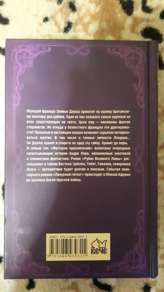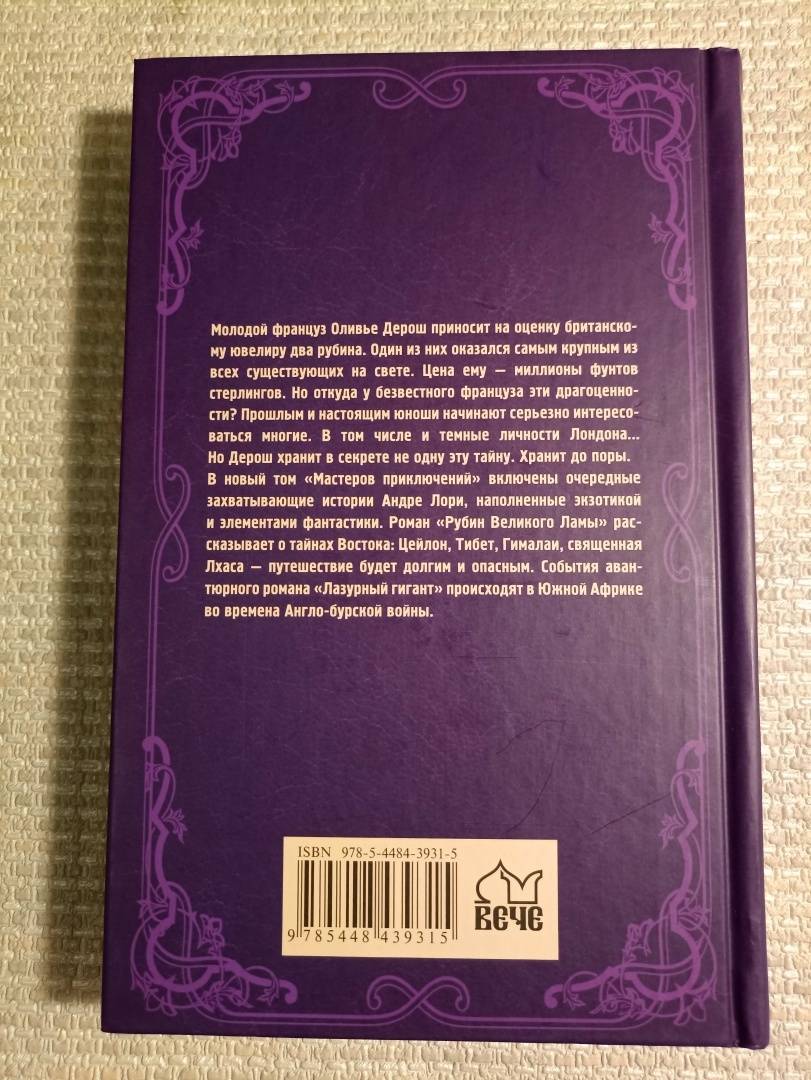 ОписаниеМолодой француз Оливье Дерош приносит на оценку британскому ювелиру два рубина. Один из них оказался самым крупным из всех существующих на свете. Цена ему - миллионы фунтов стерлингов. Но откуда у безвестного француза эти драгоценности? Прошлым и настоящим юноши начинают серьезно интересоваться многие. В том числе и темные личности Лондона… Но Дерош хранит в секрете не одну эту тайну. Хранит до поры.В новый том "Мастеров приключений" включены очередные захватывающие истории Андре Лори, наполненные экзотикой и элементами фантастики. Роман "Рубин Великого Ламы" рассказывает о тайнах Востока: Цейлон, Тибет, Гималаи, священная Лхаса - путешествие будет долгим и опасным. События авантюрного романа "Лазурный гигант" происходят в Южной Африке во времена Англо-бурской войны.Молодой француз Оливье Дерош приносит на оценку британскому ювелиру два рубина. Один из них оказался самым крупным из всех существующих на свете. Цена ему - миллионы фунтов стерлингов. Но откуда у безвестного француза эти драгоценности? Прошлым и настоящим юноши начинают серьезно интересоваться многие. В том числе и темные личности Лондона… Но Дерош хранит в секрете не одну эту тайну. Хранит до поры.В новый том "Мастеров приключений" включены очередные захватывающие истории Андре Лори, наполненные экзотикой и элементами фантастики. Роман "Рубин Великого Ламы" рассказывает о тайнах Востока: Цейлон, Тибет, Гималаи, священная Лхаса - путешествие будет долгим и опасным. События авантюрного романа "Лазурный гигант" происходят в Южной Африке во времена Англо-бурской войны.
