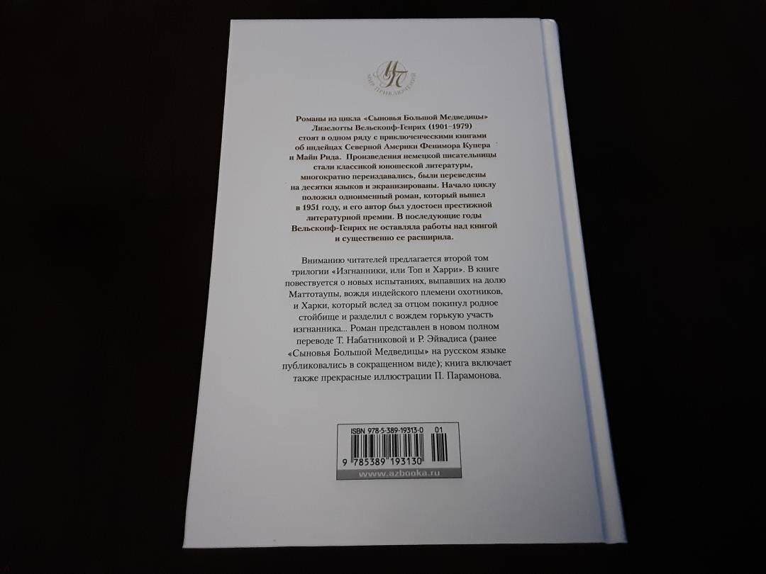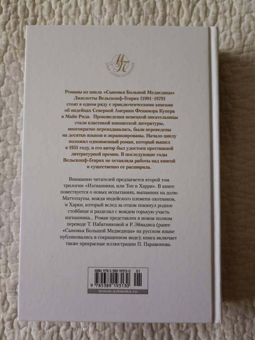 ОписаниеРоманы из цикла "Сыновья Большой Медведицы" Лизелотты Вельскопф-Генрих стоят в одном ряду с приключенческими книгами об индейцах Северной Америки Фенимора Купера и Майн Рида. Произведения немецкой писательницы стали классикой юношеской литературы, многократно переиздавались, были переведены на десятки языков и экранизированы. Начало циклу положил одноименный роман, который вышел в 1951 году, и его автор был удостоен престижной литературной премии. В последующие годы Вельскопф-Генрих не оставляла работы над книгой и существенно ее расширила. Первое полное издание увидело свет в трех томах в начале 1960-х (впоследствии цикл выходил также в виде шеститомника). За деятельную поддержку североамериканских индейцев племенной союз оглала присудил писательнице почетный титул Лакота-Ташина, Защитница Лакота. Вниманию читателей предлагается второй том трилогии "Изгнанники, или Топ и Харри". В книге повествуется о новых испытаниях, выпавших на долю Маттотаупы, вождя индейского племени охотников, и Харки, который вслед за отцом покинул родное стойбище и разделил с вождем горькую участь изгнанника... Роман представлен в новом полном переводе Т. Набатниковой и Р. Эйвадиса (ранее "Сыновья Большой Медведицы" на русском языке публиковались в сокращенном виде); книга включает также прекрасные иллюстрации П. Парамонова.СвернутьРоманы из цикла "Сыновья Большой Медведицы" Лизелотты Вельскопф-Генрих стоят в одном ряду с приключенческими книгами об индейцах Северной Америки Фенимора Купера и Майн Рида. Произведения немецкой писательницы стали классикой юношеской литературы, многократно переиздавались, были переведены на десятки языков и экранизированы. Начало циклу положил одноименный роман, который вышел в 1951 году, и его автор был удостоен престижной литературной премии. В последующие годы Вельскопф-Генрих не оставляла работы над книгой и существенно ее расширила. Первое полное издание увидело свет в трех томах в начале 1960-х (впоследствии цикл выходил также в виде шеститомника). За деятельную поддержку североамериканских индейцев племенной союз оглала присудил писательнице почетный титул Лакота-Ташина, Защитница Лакота. Вниманию читателей предлагается второй том трилогии "Изгнанники, или Топ и Харри". В книге повествуется о новых испытаниях, выпавших на долю Маттотаупы, вождя индейского племени охотников, и Харки, который вслед за отцом покинул родное стойбище и разделил с вождем горькую участь изгнанника... Роман представлен в новом полном переводе Т. Набатниковой и Р. Эйвадиса (ранее "Сыновья Большой Медведицы" на русском языке публиковались в сокращенном виде); книга включает также прекрасные иллюстрации П. Парамонова.СвернутьСвернуть