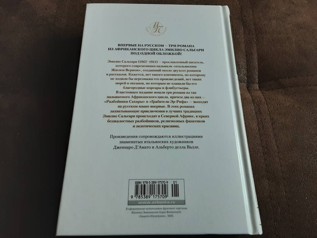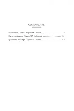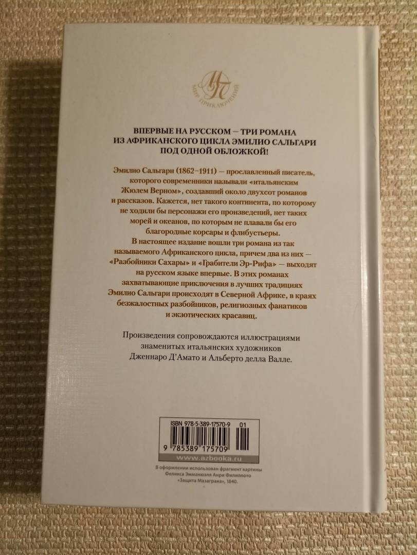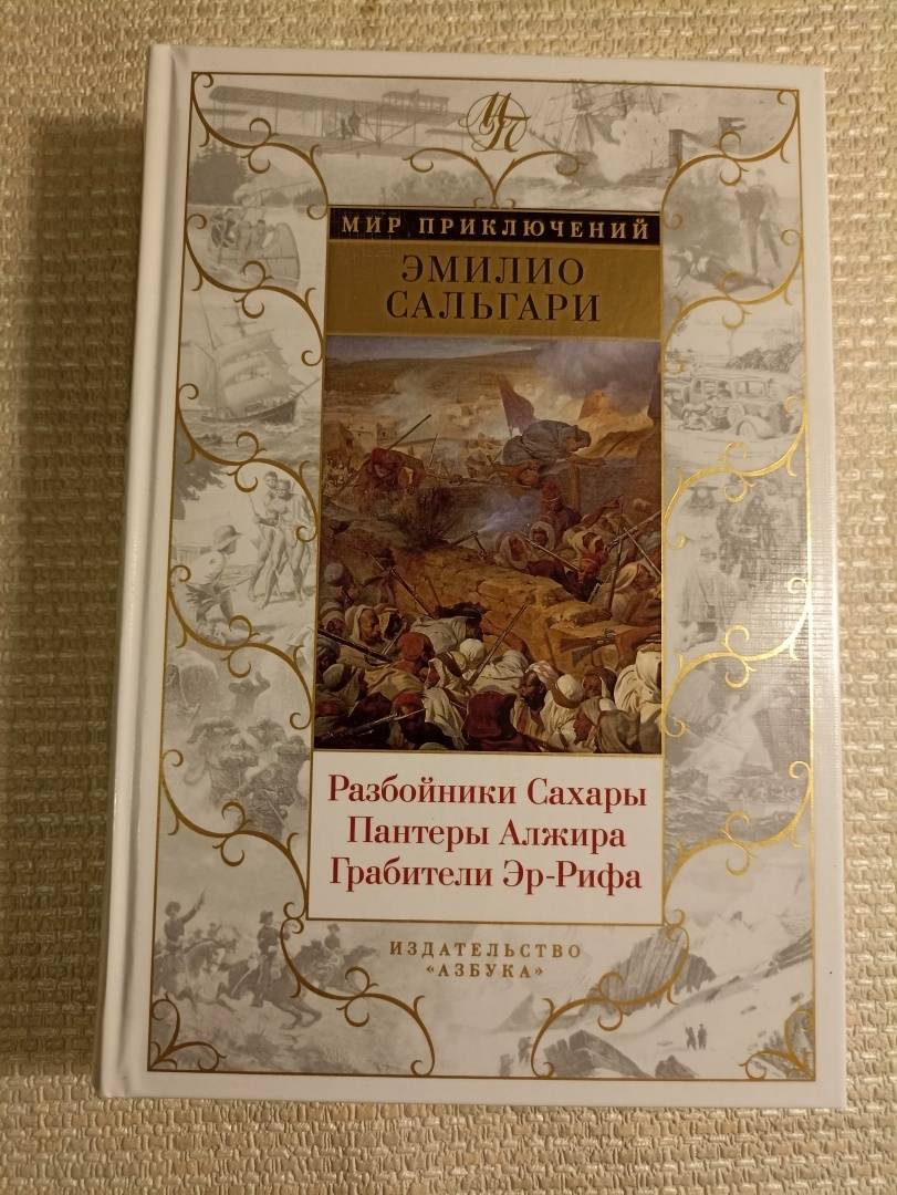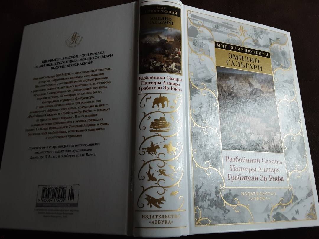 ОписаниеЭмилио Сальгари (1862–1911) — прославленный писатель, которого современники называли «итальянским Жюлем Верном», создавший около двухсот романов и рассказов. Кажется, нет такого континента, по которому не ходили бы персонажи его произведений, нет таких морей и океанов, по которым не плавали бы его благородные корсары и флибустьеры.В настоящее издание вошли три романа из так называемого Африканского цикла, причем два из них – «Разбойники Сахары» и «Грабители Эр-Рифа» выходят на русском языке впервые. В этих романах захватывающие приключения в лучших традициях Эмилио Сальгари происходят в Северной Африке, в краях безжалостных разбойников, религиозных фанатиков и экзотических красавиц.Произведения сопровождаются иллюстрациями знаменитых итальянских художников Дженнаро Д'Амато и Альберто делла Валле.Эмилио Сальгари (1862–1911) — прославленный писатель, которого современники называли «итальянским Жюлем Верном», создавший около двухсот романов и рассказов. Кажется, нет такого континента, по которому не ходили бы персонажи его произведений, нет таких морей и океанов, по которым не плавали бы его благородные корсары и флибустьеры.В настоящее издание вошли три романа из так называемого Африканского цикла, причем два из них – «Разбойники Сахары» и «Грабители Эр-Рифа» выходят на русском языке впервые. В этих романах захватывающие приключения в лучших традициях Эмилио Сальгари происходят в Северной Африке, в краях безжалостных разбойников, религиозных фанатиков и экзотических красавиц.Произведения сопровождаются иллюстрациями знаменитых итальянских художников Дженнаро Д'Амато и Альберто делла Валле.