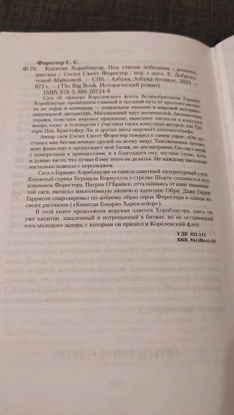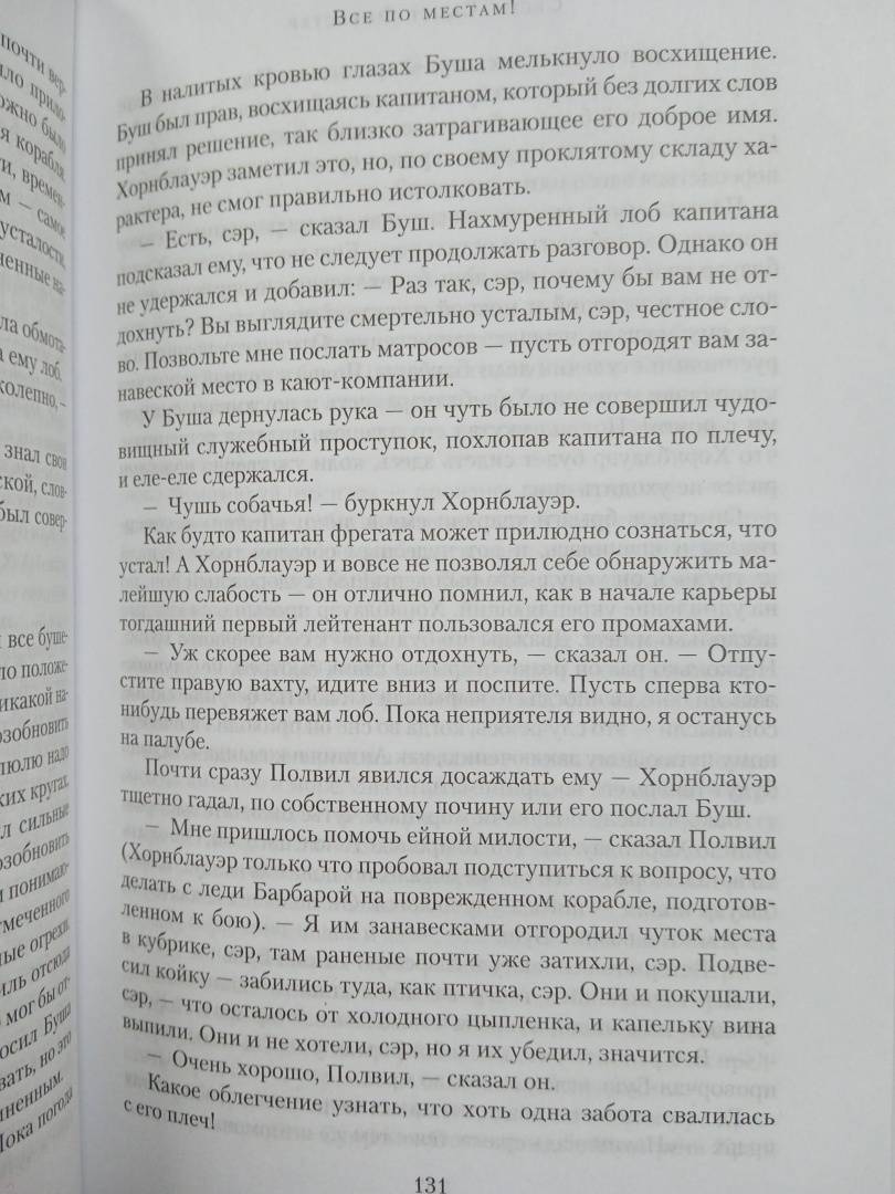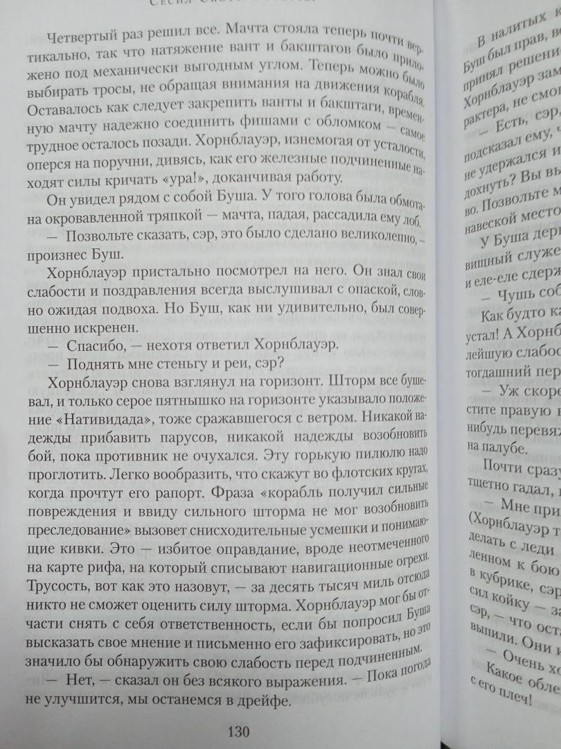 ОписаниеСага об офицере королевского флота Великобритании Горацио Хорнблауэре, прошедшем славный и трудный путь от простого мичмана до лорда и адмирала — уникальное явление в мировой историко-авантюрной литературе. Миллионный круг почитателей, бесконечные тиражи, поистине мировое признание, выведшее писателя в классики жанра, кино- и телеверсии с участием таких известных актеров как Грегори Пек, Кристофер Ли и других звезд мирового кинематографа.Автор саги, Сесил Скотт Форестер, говорил о своем герое: «Он доставил мне бесчисленных друзей по всему миру. Таможенники читают мою фамилию и пропускают мой багаж, не досматривая. Он свел меня с адмиралами и принцессами, и я благодарен ему, честное слово, хотя и думаю часто, что лучше б ему этого не делать». Не каждому писателю настолько повезло с персонажем.Сага о Горацио Хорнблауэре оставила заметный литературный след. Книжный сериал Бернарда Корнуэлла о стрелке Шарпе создавался под влиянием Форестера. Патрик О’Брайен, отталкиваясь от книг знаменитой саги, написал многотомную эпопею о капитане Обри. Даже Гарри Гаррисон спародировал по доброму образ героя Форестера в одном из своих рассказов («Капитан Гонарио Харпплейер»).В этой книге продолжена морская одиссея Хорнблауэра, здесь он уже капитан, закаленный и потрепанный в битвах, но не оставивший того молодого задора, с которым он пришел в королевский флот.СвернутьСага об офицере королевского флота Великобритании Горацио Хорнблауэре, прошедшем славный и трудный путь от простого мичмана до лорда и адмирала — уникальное явление в мировой историко-авантюрной литературе. Миллионный круг почитателей, бесконечные тиражи, поистине мировое признание, выведшее писателя в классики жанра, кино- и телеверсии с участием таких известных актеров как Грегори Пек, Кристофер Ли и других звезд мирового кинематографа.Автор саги, Сесил Скотт Форестер, говорил о своем герое: «Он доставил мне бесчисленных друзей по всему миру. Таможенники читают мою фамилию и пропускают мой багаж, не досматривая. Он свел меня с адмиралами и принцессами, и я благодарен ему, честное слово, хотя и думаю часто, что лучше б ему этого не делать». Не каждому писателю настолько повезло с персонажем.Сага о Горацио Хорнблауэре оставила заметный литературный след. Книжный сериал Бернарда Корнуэлла о стрелке Шарпе создавался под влиянием Форестера. Патрик О’Брайен, отталкиваясь от книг знаменитой саги, написал многотомную эпопею о капитане Обри. Даже Гарри Гаррисон спародировал по доброму образ героя Форестера в одном из своих рассказов («Капитан Гонарио Харпплейер»).В этой книге продолжена морская одиссея Хорнблауэра, здесь он уже капитан, закаленный и потрепанный в битвах, но не оставивший того молодого задора, с которым он пришел в королевский флот.СвернутьСвернуть