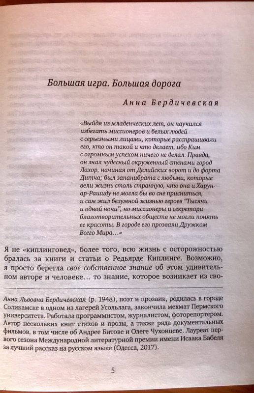 ОписаниеТот, кто читал сказку "Маугли" Редьярда Киплинга (1865-1936), тот непременно должен прочесть и его роман "Ким". Вот уж действительно "два мира - два детства". Точнее, мир-то общий, Индия на рубеже ХХ века, только джунгли разные. И не сразу скажешь, в каких жить опаснее и сложнее - в звериных или человеческих. "Киплинг осуществил свою мечту, владевшую им в пансионе Портсмута. Он прожил другое, настоящее детство. Он создал Кима О'Хара и стал им" (Анна Бердичевская). Ким - подросток-сирота, который становится учеником странствующего тибетского ламы, связанного с британской этнологической разведкой. Подросток включается в охоту за секретными документами русской разведки. Идет Большая Игра (именно Киплинг ввел в оборот этот термин) между Британской и Российской империями за доминирование в Центральной и Средней Азии. А под пером "барда английского империализма" рождается новый жанр - шпионский роман. Через несколько десяти летий дорогами школьника Кима из Лакхнау отправится Джеймс Бонд. Перевод с английского Мелитины Клягиной-Кондратьевой. Сопроводительная статья Анны Бердичевской Анна Львовна Бердичевская (р. 1948), поэт и прозаик, родилась в городе Соликамске в одном из лагерей Усольлага, закончила мехмат Пермского университета. Работала программистом, журналистом, фоторепортером. Автор нескольких книг стихов и прозы, а также ряда документальных фильмов, в том числе об Андрее Битове и Олеге Чухонцеве. Лауреат первого сезона Международной литературной премии имени Исаака Бабеля за лучший рассказ на русском языке (Одесса, 2017).СвернутьТот, кто читал сказку "Маугли" Редьярда Киплинга (1865-1936), тот непременно должен прочесть и его роман "Ким". Вот уж действительно "два мира - два детства". Точнее, мир-то общий, Индия на рубеже ХХ века, только джунгли разные. И не сразу скажешь, в каких жить опаснее и сложнее - в звериных или человеческих. "Киплинг осуществил свою мечту, владевшую им в пансионе Портсмута. Он прожил другое, настоящее детство. Он создал Кима О'Хара и стал им" (Анна Бердичевская). Ким - подросток-сирота, который становится учеником странствующего тибетского ламы, связанного с британской этнологической разведкой. Подросток включается в охоту за секретными документами русской разведки. Идет Большая Игра (именно Киплинг ввел в оборот этот термин) между Британской и Российской империями за доминирование в Центральной и Средней Азии. А под пером "барда английского империализма" рождается новый жанр - шпионский роман. Через несколько десяти летий дорогами школьника Кима из Лакхнау отправится Джеймс Бонд. Перевод с английского Мелитины Клягиной-Кондратьевой. Сопроводительная статья Анны Бердичевской Анна Львовна Бердичевская (р. 1948), поэт и прозаик, родилась в городе Соликамске в одном из лагерей Усольлага, закончила мехмат Пермского университета. Работала программистом, журналистом, фоторепортером. Автор нескольких книг стихов и прозы, а также ряда документальных фильмов, в том числе об Андрее Битове и Олеге Чухонцеве. Лауреат первого сезона Международной литературной премии имени Исаака Бабеля за лучший рассказ на русском языке (Одесса, 2017).СвернутьСвернуть