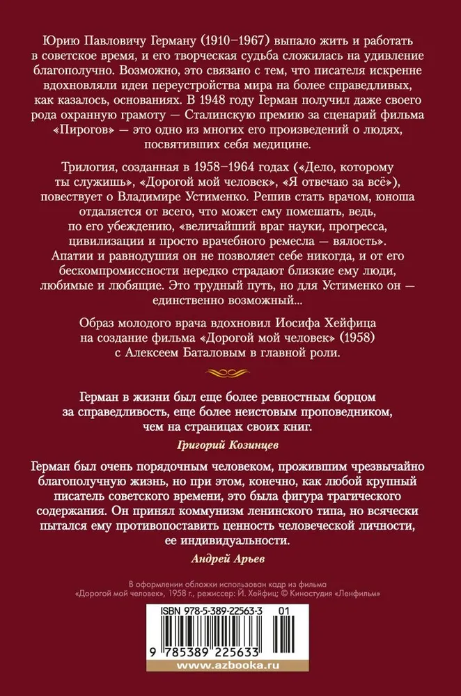 ОписаниеЮрию Павловичу Герману (1910–1967) выпало жить и работать в советское время, и его творческая судьба сложилась на удивление благополучно. Возможно, это связано с тем, что писателя искренне вдохновляли идеи переустройства мира на более справедливых, как казалось, основаниях. В 1948 году Герман получил даже своего рода охранную грамоту — Сталинскую премию за сценарий фильма «Пирогов» — это одно из многих его произведений о людях, посвятивших себя медицине. Трилогия, созданная в 1958–1964 годах («Дело, которому ты служишь», «Дорогой мой человек», «Я отвечаю за всё»), повествует о Владимире Устименко. Решив стать врачом, юноша отдаляется от всего, что может ему помешать, ведь, по его убеждению, «величайший враг науки, прогресса, цивилизации и просто врачебного ремесла — вялость». Апатии и равнодушия он не позволяет себе никогда, и от его бескомпромиссности нередко страдают близкие ему люди, любимые и любящие. Это трудный путь, но для Устименко он — единственно возможный… Образ молодого врача вдохновил Иосифа Хейфица на создание фильма «Дорогой мой человек» (1958) с Алексеем Баталовым в главной роли.