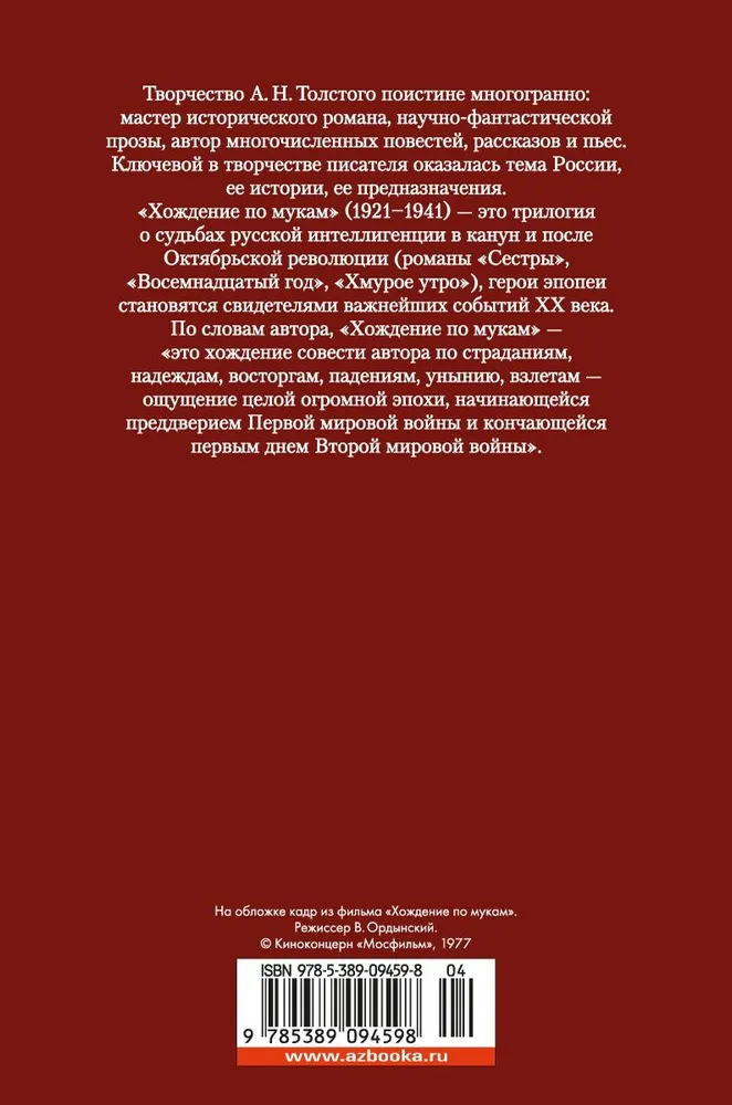 ОписаниеТворчество А. Н. Толстого поистине многогранно: мастер исторического романа, научно-фантастической прозы, автор многочисленных повестей, рассказов и пьес. Ключевой в творчестве писателя оказалась тема России, ее истории, ее предназначения. "Хождение по мукам" (1921- 1941) - это трилогия о судьбах русской интеллигенции в канун и после Октябрьской революции (романы "Сестры", "Восемнадцатый год", "Хмурое утро"), герои эпопеи становятся свидетелями важнейших событий ХХ века. По словам автора, "Хождение по мукам" - "это хождение совести автора по страданиям, надеждам, восторгам, падениям, унынию, взлетам - ощущение целой огромной эпохи, начинающейся преддверием Первой мировой войны и кончающейся первым днем Второй мировой войны". Пять причин купить 1В серию «Русская литература. Большие книги» вошли самые известные и значительные произведения величайших отечественных писателей, драматургов и поэтов. 2Классики русской литературы создают убедительные картины и ярких, запоминающихся персонажей, которые навсегда остаются в сердцах у читателей. 3Книги серии подойдут школьникам и студентам для занятий и станут отличным подарком для любого поклонника классической литературы. 4Книги серии станут замечательным дополнением любой домашней библиотеки. 5Прекрасное оформление: удобный формат, качественная бумага, комфортный для чтения шрифт и яркие запоминающиеся обложки.