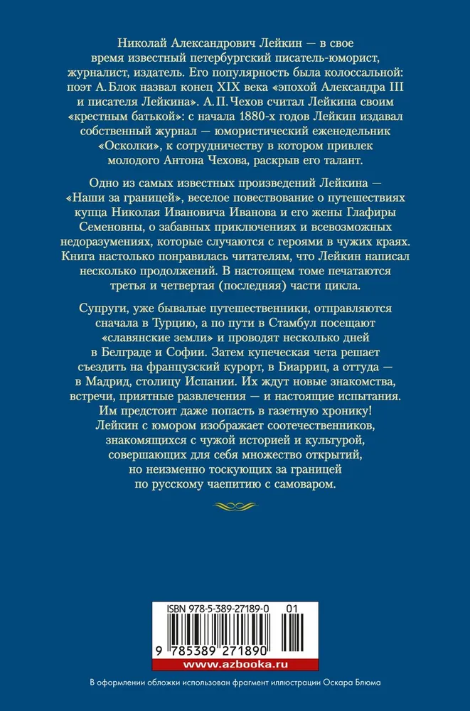 ОписаниеАннотация к книге "В гостях у турок. Под южными небесами" Лейкин Н. А.:Николай Александрович Лейкин — в свое время известный петербургский писатель-юморист, журналист, издатель. Одно из самых известных произведений Лейкина — «Наши за границей», веселое повествование о путешествиях купца Николая Ивановича Иванова и его жены Глафиры Семеновны, о забавных приключениях и всевозможных недоразумениях, которые случаются с героями в чужих краях. Книга настолько понравилась читателям, что Лейкин написал несколько продолжений. В настоящем томе печатаются третья и четвертая (последняя) части цикла. Супруги, уже бывалые путешественники, отправляются сначала в Турцию, а по пути в Стамбул посещают «славянские земли» и проводят несколько дней в Белграде и Софии. Затем купеческая чета решает съездить на французский курорт, в Биарриц, а оттуда — в Мадрид, столицу Испании. Их ждут новые знакомства, встречи, приятные развлечения — и настоящие испытания. Им предстоит даже попасть в газетную хронику! Лейкин с юмором изображает соотечественников, знакомящихся с чужой историей и культурой, совершающих для себя множество открытий, но неизменно тоскующих за границей по русскому чаепитию с самоваром. Читать дальше…
