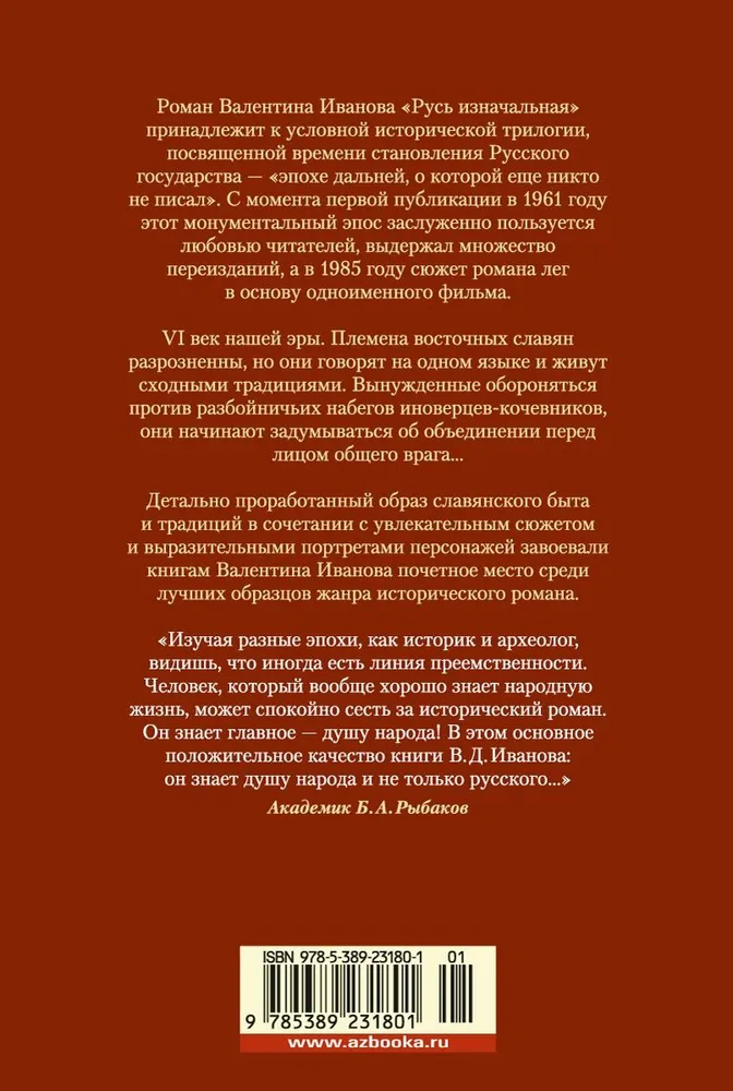 ОписаниеРоман Валентина Иванова «Русь изначальная» принадлежит к условной исторической трилогии, посвященной времени становления Русского государства — «эпохе дальней, о которой еще никто не писал». С момента первой публикации в 1961 году этот монументальный эпос заслуженно пользуется любовью читателей, выдержал множество переизданий, а в 1985 году сюжет романа лег в основу одноименного фильма. VI век нашей эры. Племена восточных славян разрозненны, но они говорят на одном языке и живут сходными традициями. Вынужденные обороняться против разбойничьих набегов иноверцев-кочевников, они начинают задумываться об объединении перед лицом общего врага… Детально проработанный образ славянского быта и традиций в сочетании с увлекательным сюжетом и выразительными портретами персонажей завоевали книгам Валентина Иванова почетное место среди лучших образцов жанра исторического романа.