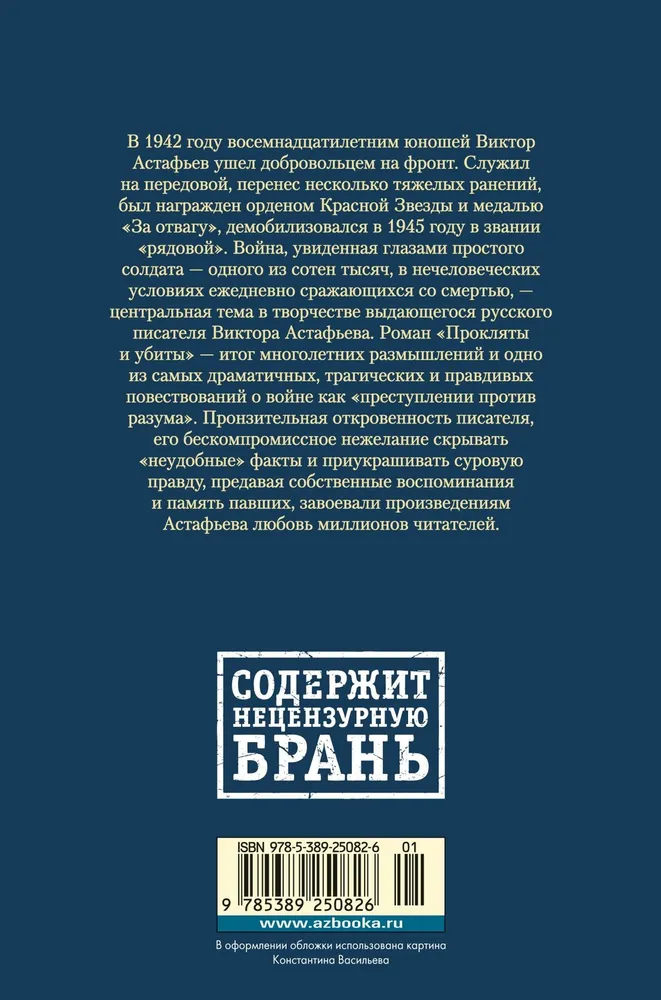 ОписаниеАннотация к книге "Прокляты и убиты" Астафьев В. П.:В 1942 году восемнадцатилетним юношей Виктор Астафьев ушел добровольцем на фронт. Служил на передовой, перенес несколько тяжелых ранений, был награжден орденом Красной Звезды и медалью «За отвагу», демобилизовался в 1945 году в звании «рядовой». Война, увиденная глазами простого солдата — одного из сотен тысяч, в нечеловеческих условиях ежедневно сражающихся со смертью, — центральная тема в творчестве выдающегося русского писателя Виктора Астафьева. Роман «Прокляты и убиты» — итог многолетних размышлений и одно из самых драматичных, трагических и правдивых повествований о войне как «преступлении против разума».Пронзительная откровенность писателя, его бескомпромиссное нежелание скрывать «неудобные» факты и приукрашивать суровую правду, предавая собственные воспоминания и память павших, завоевали произведениям Астафьева любовь миллионов читателей. Читать дальше…