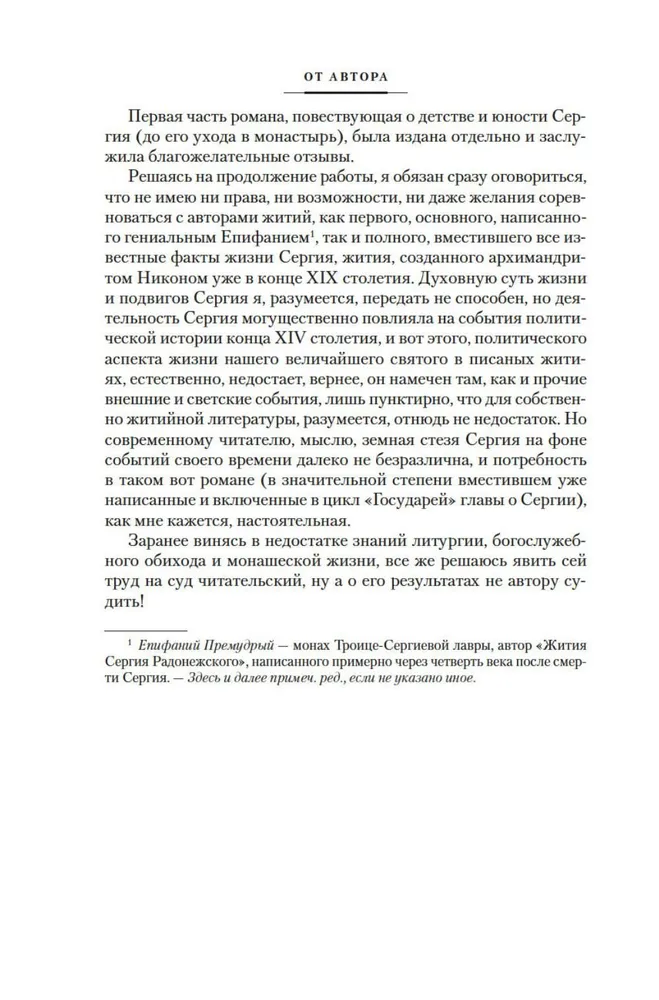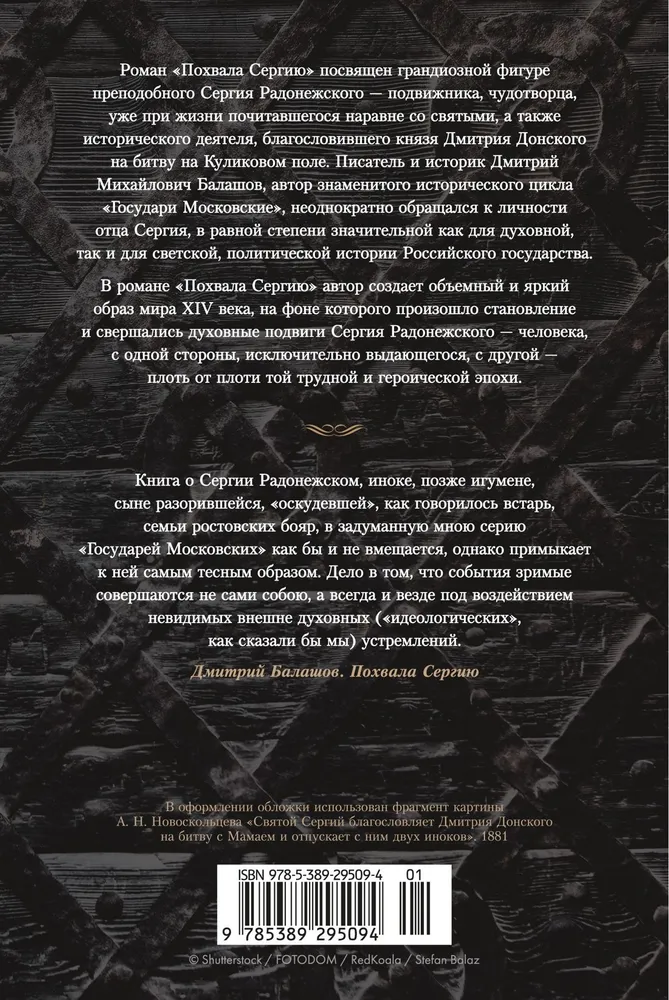 ОписаниеАннотация к книге "Похвала Сергию" Балашов Д. М.:Роман «Похвала Сергию» посвящен грандиозной фигуре преподобного Сергия Радонежского — подвижника, чудотворца, уже при жизни почитавшегося наравне со святыми, а также исторического деятеля, благословившего князя Дмитрия Донского на битву на Куликовом поле. Писатель и историк Дмитрий Михайлович Балашов, автор знаменитого исторического цикла «Государи Московские», неоднократно обращался к личности отца Сергия, в равной степени значительной как для духовной, так и для светской, политической истории Российского государства.В романе «Похвала Сергию» автор создает объемный и яркий образ мира XIV века, на фоне которого произошло становление и свершались духовные подвиги Сергия Радонежского — человека, с одной стороны, исключительно выдающегося, с другой — плоть от плоти той трудной и героической эпохи. Читать дальше…