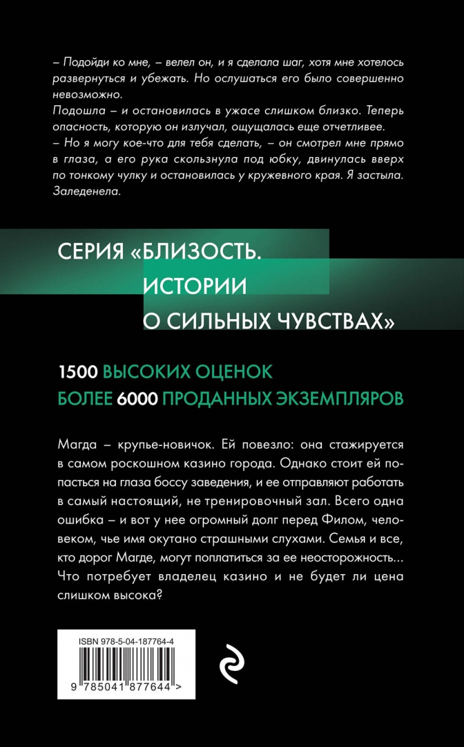 ОписаниеОкунитесь в атмосферу казино, азарта и страсти вместе с героями интригующей истории. Магда - крупье-новичок. Ей повезло: она стажируется в самом роскошном казино города. Однако стоит ей попасться на глаза боссу заведения, и ее отправляют работать в самый настоящий, уже не тренировочный зал. Всего одна ошибка - и вот у нее огромный долг перед человеком, чье имя окутано страшными слухами. Семья и все, кто дорог Магде, могут поплатиться за ее неосторожность… Что потребует владелец казино и не будет ли цена слишком высока? Раскрывайте тайны прошлого и переживайте горячие эмоции с теми, кто готов рискнуть всем ради истинной страсти. Более 6 000 проданных экземпляров. 1500 высоких оценок.Окунитесь в атмосферу казино, азарта и страсти вместе с героями интригующей истории. Магда - крупье-новичок. Ей повезло: она стажируется в самом роскошном казино города. Однако стоит ей попасться на глаза боссу заведения, и ее отправляют работать в самый настоящий, уже не тренировочный зал. Всего одна ошибка - и вот у нее огромный долг перед человеком, чье имя окутано страшными слухами. Семья и все, кто дорог Магде, могут поплатиться за ее неосторожность… Что потребует владелец казино и не будет ли цена слишком высока? Раскрывайте тайны прошлого и переживайте горячие эмоции с теми, кто готов рискнуть всем ради истинной страсти. Более 6 000 проданных экземпляров. 1500 высоких оценок.