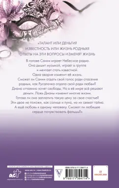 ОписаниеДиана - певица, покорившая своим голосом миллионы людей. Она красива, талантлива и популярна. В нее влюблены Дастин - известный актер, за красивым лицом которого скрывается надменность и холодность, и Кристиан - незаконорожденный сын богатого человека, привыкший получать все, что хочет. Но никто не знает, что голос Дианы - это Санни, талантливая студентка музыкальной школы искусств. И пока на сцене одна, за сценой поет другая. Что заставило Санни продать свой голос?Сколько стоит чужой талант?Кто будет достоин любви, а кто останется ни с чем?И что победит: истинный талант или деньги? Небесная музыка начинает играть над их головами...Диана - певица, покорившая своим голосом миллионы людей. Она красива, талантлива и популярна. В нее влюблены Дастин - известный актер, за красивым лицом которого скрывается надменность и холодность, и Кристиан - незаконорожденный сын богатого человека, привыкший получать все, что хочет. Но никто не знает, что голос Дианы - это Санни, талантливая студентка музыкальной школы искусств. И пока на сцене одна, за сценой поет другая. Что заставило Санни продать свой голос?Сколько стоит чужой талант?Кто будет достоин любви, а кто останется ни с чем?И что победит: истинный талант или деньги? Небесная музыка начинает играть над их головами...