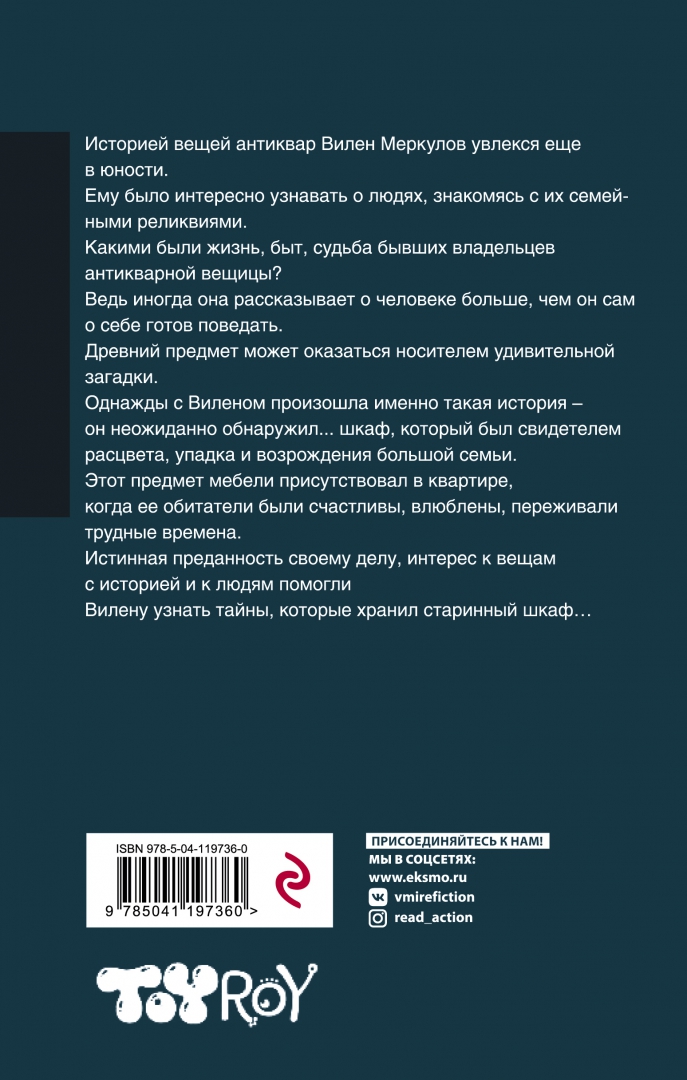 ОписаниеИсторией вещей антиквар Вилен Меркулов увлекся еще в юности. Ему было интересно узнавать о людях, знакомясь с их семейными реликвиями. Какой была жизнь, быт, судьба бывших владельцев антикварной вещицы. Ведь иногда она рассказывает о человеке больше, чем он сам о себе готов поведать. Древний предмет может оказаться носителем удивительной загадки. Однажды с Виленом произошла именно такая история - он неожиданно обнаружил... шкаф, который был свидетелем расцвета, упадка и возрождения большой семьи. Этот предмет мебели присутствовал в квартире, когда ее обитатели были счастливы, влюблены, переживали трудные времена. Истинная преданность своему делу, интерес к вещам с историей и к людям помогли Вилену узнать тайны, которые хранил старинный шкаф…Историей вещей антиквар Вилен Меркулов увлекся еще в юности. Ему было интересно узнавать о людях, знакомясь с их семейными реликвиями. Какой была жизнь, быт, судьба бывших владельцев антикварной вещицы. Ведь иногда она рассказывает о человеке больше, чем он сам о себе готов поведать. Древний предмет может оказаться носителем удивительной загадки. Однажды с Виленом произошла именно такая история - он неожиданно обнаружил... шкаф, который был свидетелем расцвета, упадка и возрождения большой семьи. Этот предмет мебели присутствовал в квартире, когда ее обитатели были счастливы, влюблены, переживали трудные времена. Истинная преданность своему делу, интерес к вещам с историей и к людям помогли Вилену узнать тайны, которые хранил старинный шкаф…