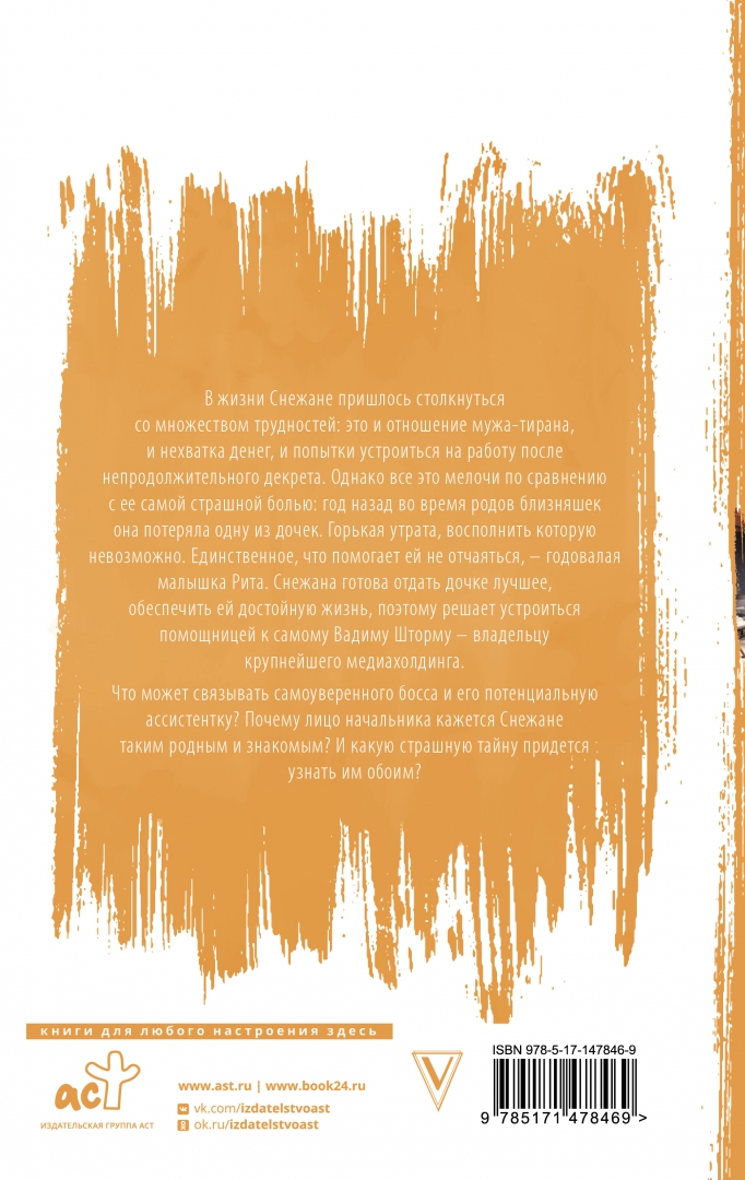 ОписаниеВероника Лесневская - автор сентиментальных романов-бестселлеров, которые завоевали сердца миллионов читателей. В жизни Снежане пришлось столкнуться со множеством трудностей: это и отношение мужа-тирана, и нехватка денег, и попытки устроиться на работу после непродолжительного декрета. Однако все это мелочи по сравнению с ее самой страшной болью: год назад во время родов близняшек онапотеряла одну из дочек. Горькая утрата, восполнить которую невозможно. Единственное, что помогает ей не отчаяться, – годовалая малышка Рита. Снежана готова отдать дочке лучшее, обеспечить ей достойную жизнь, поэтому решает устроиться помощницей к самому Вадиму Шторму — владельцу крупнейшего медиахолдинга. Что может связывать самоуверенного босса и его потенциальную ассистентку? Почему лицо начальника кажется Снежане таким родным и знакомым? И какую страшную тайну придется узнать им обоим?Вероника Лесневская - автор сентиментальных романов-бестселлеров, которые завоевали сердца миллионов читателей. В жизни Снежане пришлось столкнуться со множеством трудностей: это и отношение мужа-тирана, и нехватка денег, и попытки устроиться на работу после непродолжительного декрета. Однако все это мелочи по сравнению с ее самой страшной болью: год назад во время родов близняшек онапотеряла одну из дочек. Горькая утрата, восполнить которую невозможно. Единственное, что помогает ей не отчаяться, – годовалая малышка Рита. Снежана готова отдать дочке лучшее, обеспечить ей достойную жизнь, поэтому решает устроиться помощницей к самому Вадиму Шторму — владельцу крупнейшего медиахолдинга. Что может связывать самоуверенного босса и его потенциальную ассистентку? Почему лицо начальника кажется Снежане таким родным и знакомым? И какую страшную тайну придется узнать им обоим?