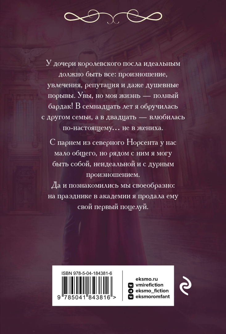 ОписаниеУ дочери королевского посла идеальным должно быть все: произношение, увлечения, репутация и даже душевные порывы. Увы, но моя жизнь — полный бардак! В семнадцать лет я обручилась с другом семьи, а в двадцать — влюбилась по-настоящему… не в жениха. С парнем из северного Норсента у нас мало общего, но рядом с ним я могу быть собой, неидеальной и с дурным произношением. Да и познакомились мы своеобразно: на празднике в академии я продала ему свой первый поцелуй.У дочери королевского посла идеальным должно быть все: произношение, увлечения, репутация и даже душевные порывы. Увы, но моя жизнь — полный бардак! В семнадцать лет я обручилась с другом семьи, а в двадцать — влюбилась по-настоящему… не в жениха. С парнем из северного Норсента у нас мало общего, но рядом с ним я могу быть собой, неидеальной и с дурным произношением. Да и познакомились мы своеобразно: на празднике в академии я продала ему свой первый поцелуй.