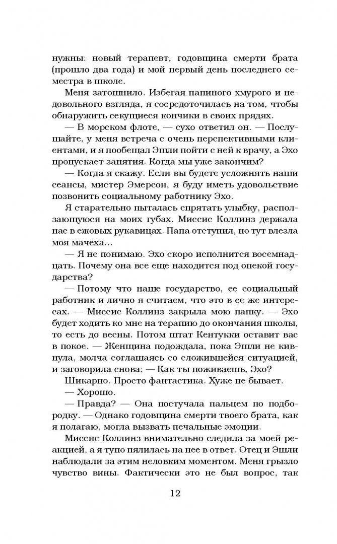ОписаниеЭхо Эмерсон, красавица, самая популярная девочка в школе. Что случилось той ночью, после которой Эхо превратилась в неудачницу со "странными" шрамами на руках, о которой шепчутся по углам.Жесткий и прагматичный Ной Хатчинс привык использовать девушек. Его взгляды на жизнь далеки от романтики и сострадания.Эхо и Ной - полюсы с разноименным зарядом, которые, как известно, притягиваются.Эхо Эмерсон, красавица, самая популярная девочка в школе. Что случилось той ночью, после которой Эхо превратилась в неудачницу со "странными" шрамами на руках, о которой шепчутся по углам.Жесткий и прагматичный Ной Хатчинс привык использовать девушек. Его взгляды на жизнь далеки от романтики и сострадания.Эхо и Ной - полюсы с разноименным зарядом, которые, как известно, притягиваются.