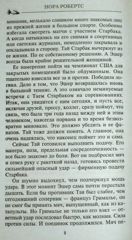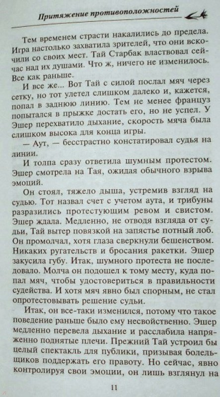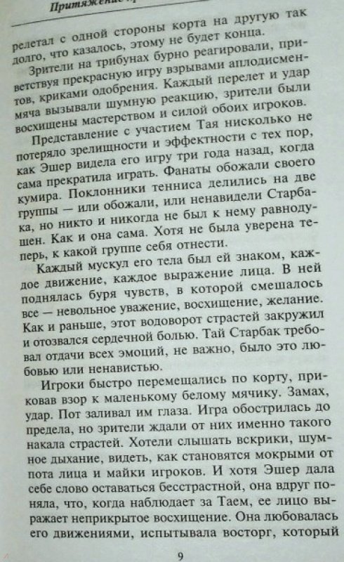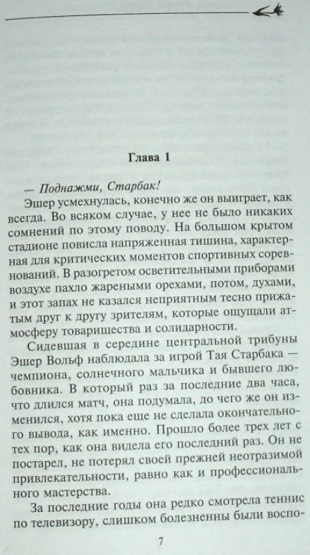 ОписаниеДраматический любовный опыт двух звезд тенниса Эшер Вольф и Тая Старбака закончился разрывом. Безумная страсть свела их, и она же развела, казалось бы, навсегда. Эшер вышла замуж за англичанина аристократа и покончила со спортом. Тай, пытаясь забыть Эшер, продолжал ставить рекорды и вел жизнь плейбоя, пока в один прекрасный день они снова не встретились. За их плечами груз обид, непонимания и клубок нешуточных секретов, в которых таится суть их размолвки. Но они об этом не догадываются. Сумеют ли они найти дорогу друг к другу, потому что, увы, их страсть не остыла…Драматический любовный опыт двух звезд тенниса Эшер Вольф и Тая Старбака закончился разрывом. Безумная страсть свела их, и она же развела, казалось бы, навсегда. Эшер вышла замуж за англичанина аристократа и покончила со спортом. Тай, пытаясь забыть Эшер, продолжал ставить рекорды и вел жизнь плейбоя, пока в один прекрасный день они снова не встретились. За их плечами груз обид, непонимания и клубок нешуточных секретов, в которых таится суть их размолвки. Но они об этом не догадываются. Сумеют ли они найти дорогу друг к другу, потому что, увы, их страсть не остыла…