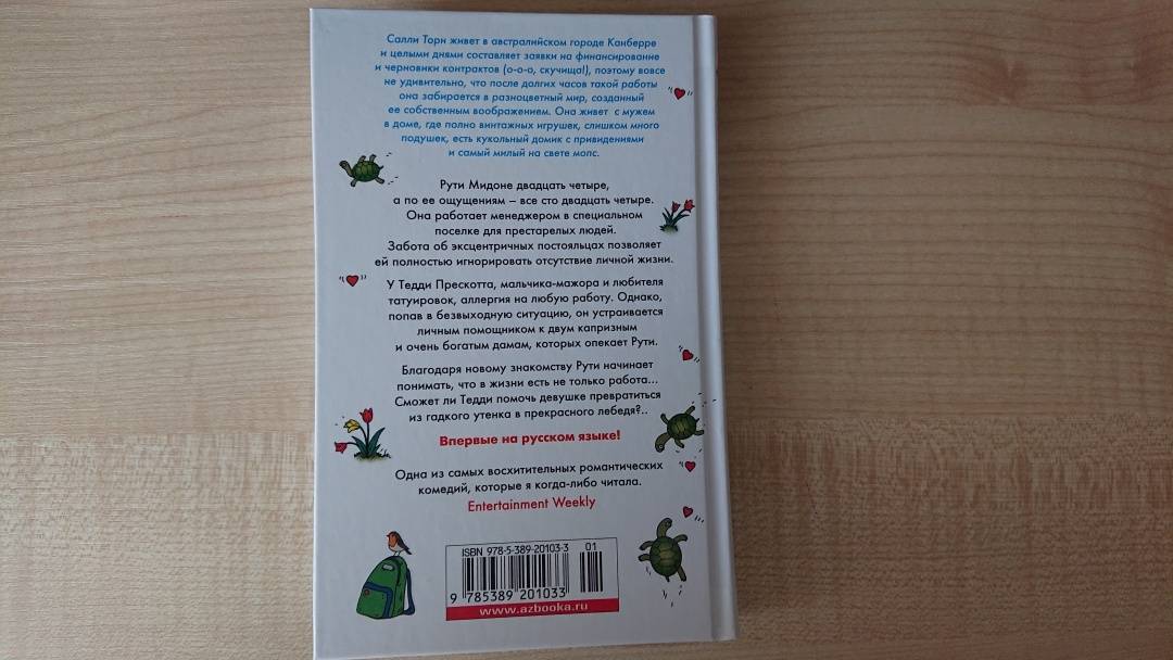 ОписаниеРути Мидоне двадцать четыре, а по ее ощущениям – все сто двадцать четыре. Она работает менеджером в специальном поселке для престарелых людей. Забота об эксцентричных постояльцах позволяет ей полностью игнорировать отсутствие личной жизни. У Тедди Прескотта, мальчика-мажора и любителя татуировок, аллергия на любую работу. Однако, попав в безвыходную ситуацию, он устраивается личным помощником к двум капризным и очень богатым дамам, которых опекает Рути. Благодаря новому знакомству Рути начинает понимать, что в жизни есть не только работа... Сможет ли Тедди помочь девушке превратиться из гадкого утенка в прекрасного лебедя?..Впервые на русском языке!Рути Мидоне двадцать четыре, а по ее ощущениям – все сто двадцать четыре. Она работает менеджером в специальном поселке для престарелых людей. Забота об эксцентричных постояльцах позволяет ей полностью игнорировать отсутствие личной жизни. У Тедди Прескотта, мальчика-мажора и любителя татуировок, аллергия на любую работу. Однако, попав в безвыходную ситуацию, он устраивается личным помощником к двум капризным и очень богатым дамам, которых опекает Рути. Благодаря новому знакомству Рути начинает понимать, что в жизни есть не только работа... Сможет ли Тедди помочь девушке превратиться из гадкого утенка в прекрасного лебедя?..Впервые на русском языке!