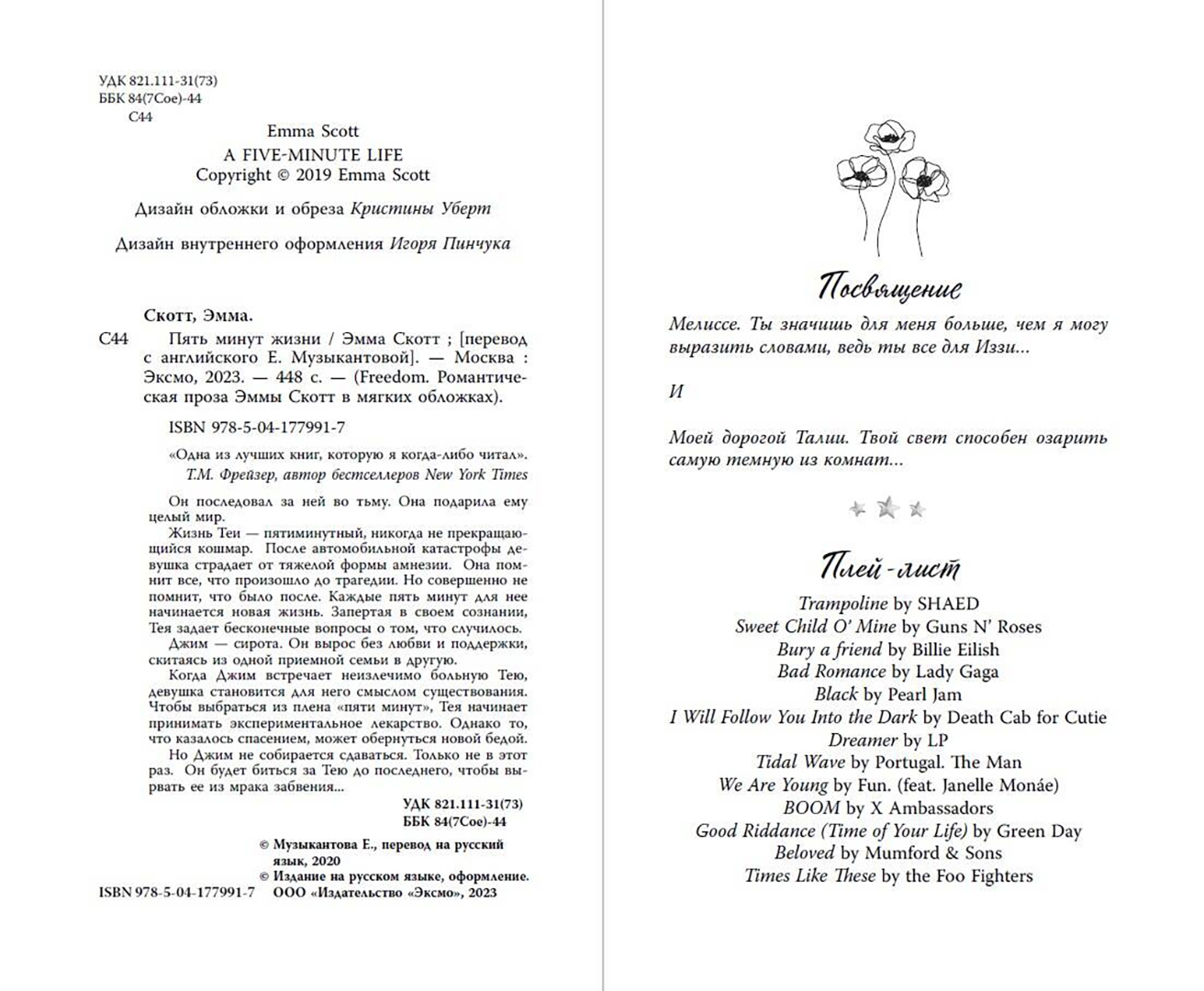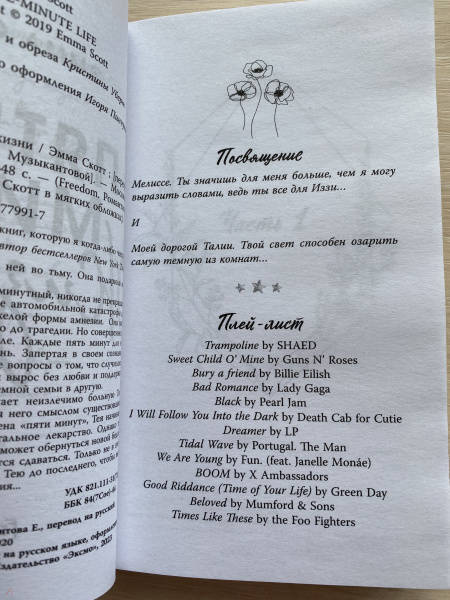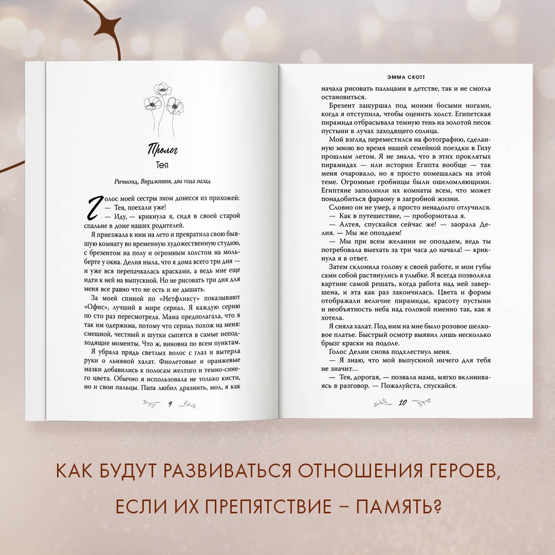 ОписаниеРомантические бестселлеры Эммы Скотт в новом, стильном оформлении. Удобный формат, мягкая обложка — все для того, чтобы не расставаться с любимыми героями. Уникальные яркие узоры на обрезе, блестящая фольга — собери всю коллекцию на своей полке! Книга про любовь художницы с амнезией и сироты. Каково это – любить ту, кто помнит тебя всего пять минут?Жизнь Теи — пятиминутный, никогда не прекращающийся кошмар. После автомобильной катастрофы девушка страдает от тяжелой формы амнезии. Она помнит все, что произошло до трагедии. Но совершенно не помнит, что было после. Каждые пять минут для нее начинается новая жизнь. Запертая в своем сознании, Тея задает бесконечные вопросы о том, что случилось. Джим — сирота. Он вырос без любви и поддержки, скитаясь из одной приемной семьи в другую. Когда Джим встречает неизлечимо больную Тею, девушка становится для него смыслом существования. Чтобы выбраться из плена «пяти минут», Тея начинает принимать экспериментальное лекарство. Однако то, что казалось спасением, может обернуться новой бедой. Но Джим не собирается сдаваться. Только не в этот раз. Он будет биться за Тею до последнего, чтобы вырвать ее из мрака забвения...Книга о настоящих чувствах и их способности стать путеводной звездой. Испытайте сильные эмоции и проведите выходные в компании романтической художественной литературы! Лучший выбор для любителей книг романтики.С этой книгой ищут: любовные романы, freedom книги, романтика книги, грешник, сгорая дотла, среди тысячи слов, сейчас и навечно, дотянуться до звезд, стань моим завтра, зажечь небеса, young adultСвернутьРомантические бестселлеры Эммы Скотт в новом, стильном оформлении. Удобный формат, мягкая обложка — все для того, чтобы не расставаться с любимыми героями. Уникальные яркие узоры на обрезе, блестящая фольга — собери всю коллекцию на своей полке! Книга про любовь художницы с амнезией и сироты. Каково это – любить ту, кто помнит тебя всего пять минут?Жизнь Теи — пятиминутный, никогда не прекращающийся кошмар. После автомобильной катастрофы девушка страдает от тяжелой формы амнезии. Она помнит все, что произошло до трагедии. Но совершенно не помнит, что было после. Каждые пять минут для нее начинается новая жизнь. Запертая в своем сознании, Тея задает бесконечные вопросы о том, что случилось. Джим — сирота. Он вырос без любви и поддержки, скитаясь из одной приемной семьи в другую. Когда Джим встречает неизлечимо больную Тею, девушка становится для него смыслом существования. Чтобы выбраться из плена «пяти минут», Тея начинает принимать экспериментальное лекарство. Однако то, что казалось спасением, может обернуться новой бедой. Но Джим не собирается сдаваться. Только не в этот раз. Он будет биться за Тею до последнего, чтобы вырвать ее из мрака забвения...Книга о настоящих чувствах и их способности стать путеводной звездой. Испытайте сильные эмоции и проведите выходные в компании романтической художественной литературы! Лучший выбор для любителей книг романтики.С этой книгой ищут: любовные романы, freedom книги, романтика книги, грешник, сгорая дотла, среди тысячи слов, сейчас и навечно, дотянуться до звезд, стань моим завтра, зажечь небеса, young adultСвернутьСвернуть