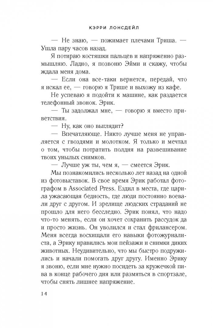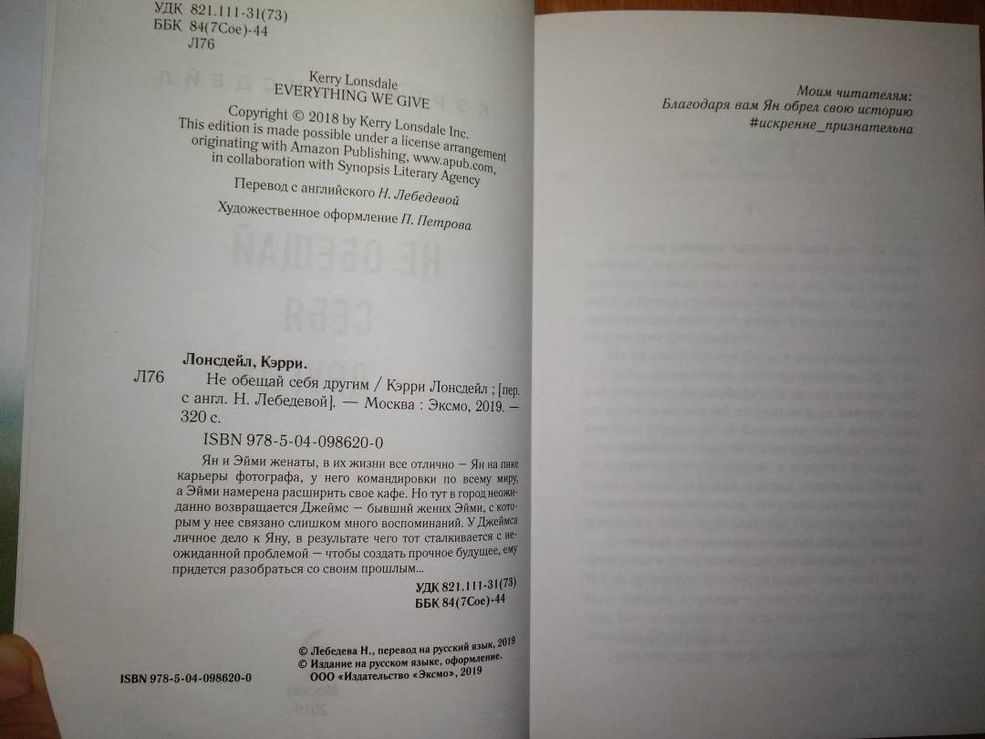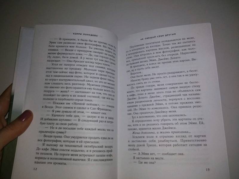 ОписаниеРоман "Не обещай себя другим" открывает новую страницу в жизни уже многим полюбившихся героев - Эйми, Яна и Джеймса. Те, кто уже знаком с ними, с радостью прочтут новую историю. А тем, кто встретится с ними впервые, мы даже немного завидуем: им только предстоит узнать этих харизматичных персонажей.Ян и Эйми женаты, в их жизни все отлично - Ян на пике карьеры фотографа, у него командировки по всему миру, а Эйми намерена расширить свое кафе. Но тут в город неожиданно возвращается Джеймс - бывший жених Эйми, с которым у нее связано слишком много воспоминаний. У Джеймса личное дело к Яну, в результате чего тот сталкивается с неожиданной проблемой - чтобы создать прочное будущее, ему придется разобраться со своим прошлым…Роман "Не обещай себя другим" открывает новую страницу в жизни уже многим полюбившихся героев - Эйми, Яна и Джеймса. Те, кто уже знаком с ними, с радостью прочтут новую историю. А тем, кто встретится с ними впервые, мы даже немного завидуем: им только предстоит узнать этих харизматичных персонажей.Ян и Эйми женаты, в их жизни все отлично - Ян на пике карьеры фотографа, у него командировки по всему миру, а Эйми намерена расширить свое кафе. Но тут в город неожиданно возвращается Джеймс - бывший жених Эйми, с которым у нее связано слишком много воспоминаний. У Джеймса личное дело к Яну, в результате чего тот сталкивается с неожиданной проблемой - чтобы создать прочное будущее, ему придется разобраться со своим прошлым…
