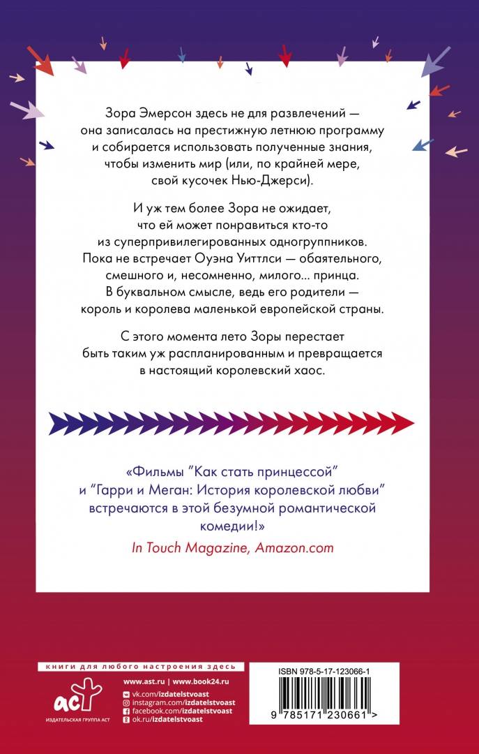ОписаниеЗора Эмерсон здесь не для развлечений — она записалась на престижную летнюю программу и собирается использовать полученные знания, чтобы изменить мир (или, по крайней мере, свой кусочек Нью-Джерси)И уж тем более Зора не ожидает, что ей может понравиться кто-то из суперпривилегированных одногруппников. Пока не встречает Оуэна Уиттлси — обаятельного, смешного и, несомненно, милого... принца. В буквальном смысле, ведь его родители — король и королева маленькой европейской страны.С этого момента лето Зоры перестает быть таким уж распланированным и превращается в настоящий королевский хаос.Зора Эмерсон здесь не для развлечений — она записалась на престижную летнюю программу и собирается использовать полученные знания, чтобы изменить мир (или, по крайней мере, свой кусочек Нью-Джерси)И уж тем более Зора не ожидает, что ей может понравиться кто-то из суперпривилегированных одногруппников. Пока не встречает Оуэна Уиттлси — обаятельного, смешного и, несомненно, милого... принца. В буквальном смысле, ведь его родители — король и королева маленькой европейской страны.С этого момента лето Зоры перестает быть таким уж распланированным и превращается в настоящий королевский хаос.