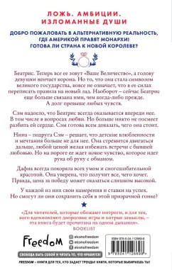 ОписаниеЛожь. Амбиции. Изломанные душиДобро пожаловать в альтернативную реальность, где Америкой правят монархи!Готова ли страна к новой королеве?Беатрис. Теперь все ее зовут "Ваше Величество", а голову девушки венчает корона. Но то, что она стала символом великого государства, вовсе не означает, что в ее силах переписать правила на новый лад. Наоборот – сейчас Беатрис еще больше связана ими, чем когда-либо прежде. А долг превыше любых чувств.Сэм надоело, что Беатрис всегда оказывается впереди нее. В том числе, в вопросах любви. Но больше никто не посмеет разбить ей сердце. Сэм готова всем доказать, чего она стоит.Нина – подруга Сэм – решает, что детские влюбленности и мечтания больше не для нее. Она стремится двигаться дальше, любой ценой желая избежать встречи с бывшей любовью. Но на пороге ее ждет новое чувство. Которое идет рука об руку с обманом.Дафна всегда покоряла всех умом и сногсшибательной красотой. Она уверена, что получит все, чего хочет. Правда цена за победу может оказаться слишком высокой.У каждой из них свои намерения и ставки на успех. Но смогут ли они сохранить себя в этой призрачной гонке?СвернутьЛожь. Амбиции. Изломанные душиДобро пожаловать в альтернативную реальность, где Америкой правят монархи!Готова ли страна к новой королеве?Беатрис. Теперь все ее зовут "Ваше Величество", а голову девушки венчает корона. Но то, что она стала символом великого государства, вовсе не означает, что в ее силах переписать правила на новый лад. Наоборот – сейчас Беатрис еще больше связана ими, чем когда-либо прежде. А долг превыше любых чувств.Сэм надоело, что Беатрис всегда оказывается впереди нее. В том числе, в вопросах любви. Но больше никто не посмеет разбить ей сердце. Сэм готова всем доказать, чего она стоит.Нина – подруга Сэм – решает, что детские влюбленности и мечтания больше не для нее. Она стремится двигаться дальше, любой ценой желая избежать встречи с бывшей любовью. Но на пороге ее ждет новое чувство. Которое идет рука об руку с обманом.Дафна всегда покоряла всех умом и сногсшибательной красотой. Она уверена, что получит все, чего хочет. Правда цена за победу может оказаться слишком высокой.У каждой из них свои намерения и ставки на успех. Но смогут ли они сохранить себя в этой призрачной гонке?СвернутьСвернуть