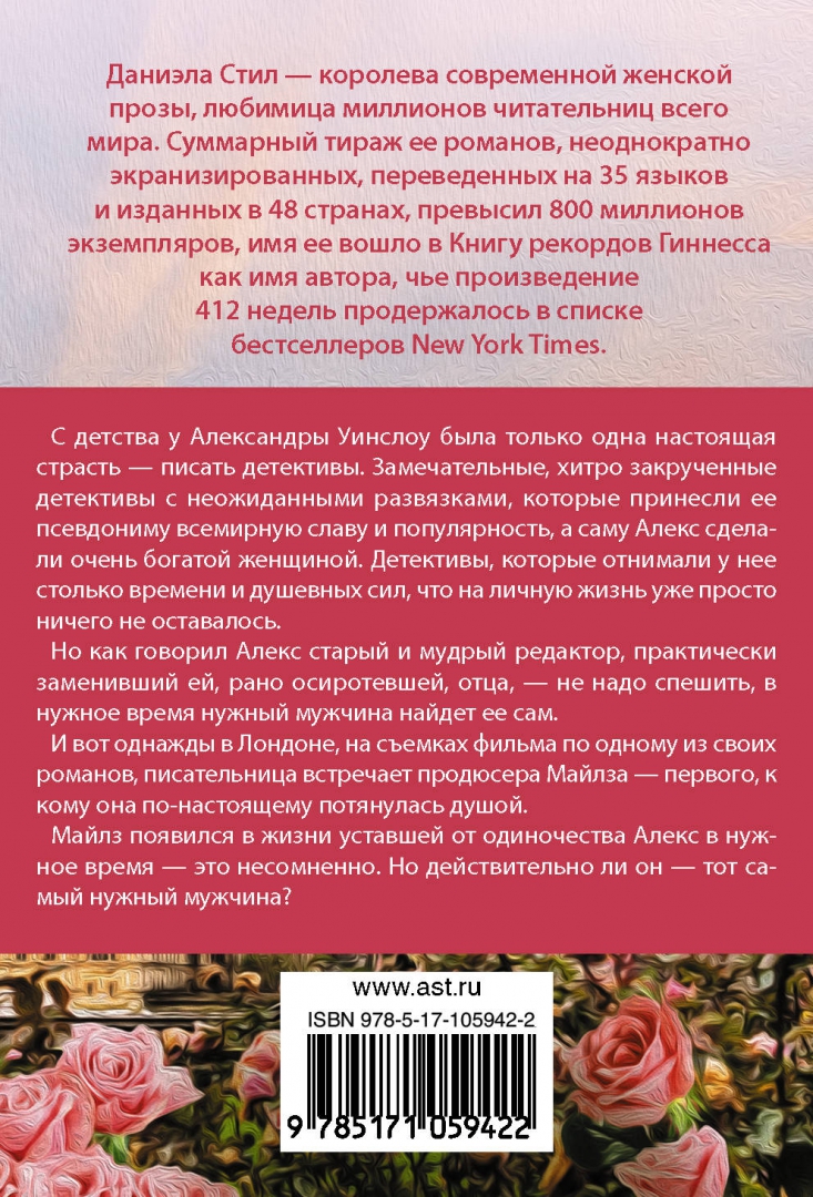 ОписаниеС детства у Александры Уинслоу была только одна настоящая страсть – писать детективы. Замечательные, хитро закрученные детективы с неожиданными развязками, которые принесли ее псевдониму всемирную славу и популярность, а саму Алекс сделали очень богатой женщиной. Детективы, которые отнимали у нее столько времени и душевных сил, что на личную жизнь уже просто ничего не оставалось.Но как говорил Алекс старый и мудрый редактор, практически заменивший ей, рано осиротевшей, отца, – не надо спешить, в нужное время нужный мужчина найдет ее сам. И вот однажды в Лондоне, на съемках фильма по одному из своих романов, писательница встречает продюсера Майлза – первого, к кому она по-настоящему потянулась душой. Майлз появился в жизни уставшей от одиночества Алекс в нужное время – это несомненно. Но действительно ли он – тот самый нужный мужчина?С детства у Александры Уинслоу была только одна настоящая страсть – писать детективы. Замечательные, хитро закрученные детективы с неожиданными развязками, которые принесли ее псевдониму всемирную славу и популярность, а саму Алекс сделали очень богатой женщиной. Детективы, которые отнимали у нее столько времени и душевных сил, что на личную жизнь уже просто ничего не оставалось.Но как говорил Алекс старый и мудрый редактор, практически заменивший ей, рано осиротевшей, отца, – не надо спешить, в нужное время нужный мужчина найдет ее сам. И вот однажды в Лондоне, на съемках фильма по одному из своих романов, писательница встречает продюсера Майлза – первого, к кому она по-настоящему потянулась душой. Майлз появился в жизни уставшей от одиночества Алекс в нужное время – это несомненно. Но действительно ли он – тот самый нужный мужчина?