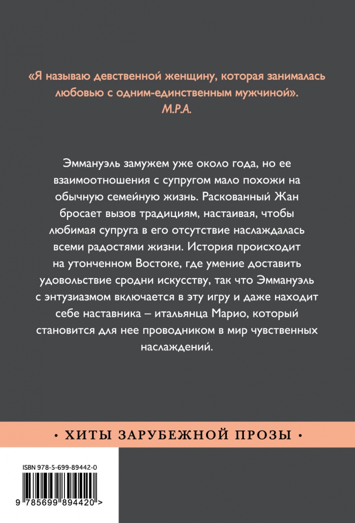 ОписаниеЭммануэль замужем уже около года, но ее взаимоотношения с супругом мало похожи на обычную семейную жизнь. Раскованный Жан бросает вызов традициям, настаивая, чтобы любимая супруга в его отсутствие наслаждалась всеми радостями жизни. История происходит на утонченном Востоке, где умение доставить удовольствие сродни искусству, так что Эммануэль с энтузиазмом включается в эту игру и даже находит себе наставника - итальянца Марио, который становится для нее проводником в мир чувственных наслаждений.Эммануэль замужем уже около года, но ее взаимоотношения с супругом мало похожи на обычную семейную жизнь. Раскованный Жан бросает вызов традициям, настаивая, чтобы любимая супруга в его отсутствие наслаждалась всеми радостями жизни. История происходит на утонченном Востоке, где умение доставить удовольствие сродни искусству, так что Эммануэль с энтузиазмом включается в эту игру и даже находит себе наставника - итальянца Марио, который становится для нее проводником в мир чувственных наслаждений.