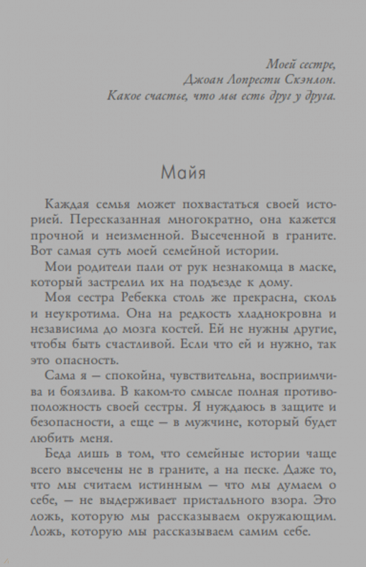 ОписаниеЭто была любовь с первого взгляда: Майя увидела, с каким вдохновением Адам работает, и поняла, что, если этот парень не станет ее мужем, она будет жалеть об этом всю жизнь. И Ребекке он сразу понравился.Сестры Ребекка и Майя пережили в детстве страшную трагедию и с тех пор стараются во всем поддерживать друг друга. Неугомонная Ребекка не сидит на месте, а Майя поглощена бытовыми и семейными проблемами. Но в трудную минуту одна всегда готова помочь и даже подменить другую. Так ли безобидно это желание?Это была любовь с первого взгляда: Майя увидела, с каким вдохновением Адам работает, и поняла, что, если этот парень не станет ее мужем, она будет жалеть об этом всю жизнь. И Ребекке он сразу понравился.Сестры Ребекка и Майя пережили в детстве страшную трагедию и с тех пор стараются во всем поддерживать друг друга. Неугомонная Ребекка не сидит на месте, а Майя поглощена бытовыми и семейными проблемами. Но в трудную минуту одна всегда готова помочь и даже подменить другую. Так ли безобидно это желание?