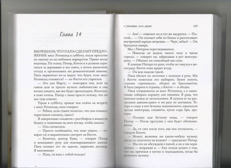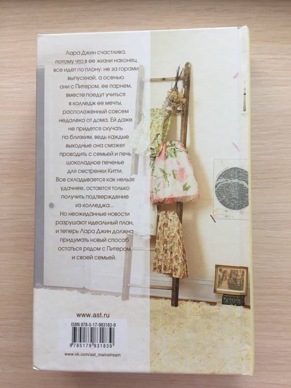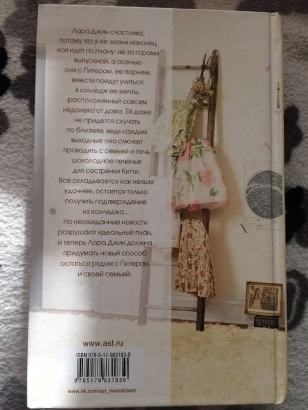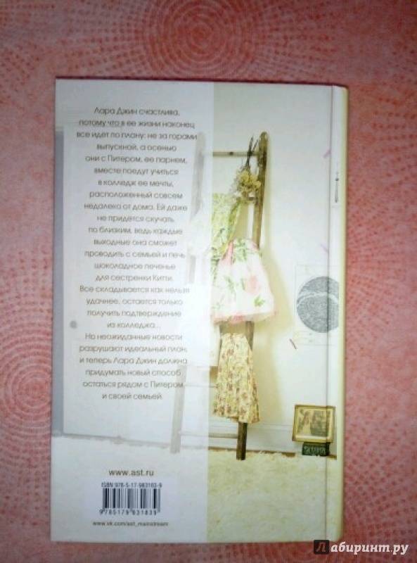 ОписаниеЛара Джин счастлива, потому что в ее жизни наконец все идет по плану: не за горами выпускной, а осенью они с Питером, ее парнем, вместе поедут учиться в колледж ее мечты, расположенный совсем недалеко от дома. Ей даже не придется скучать по близким, ведь каждые выходные она сможет проводить с семьей и печь шоколадное печенье для сестренки Китти. Все складывается как нельзя удачнее, остается только получить подтверждение из колледжа... Но неожиданные новости разрушают идеальный план, и теперь Лара Джин должна придумать новый способ остаться рядом с Питером и своей семьей.Лара Джин счастлива, потому что в ее жизни наконец все идет по плану: не за горами выпускной, а осенью они с Питером, ее парнем, вместе поедут учиться в колледж ее мечты, расположенный совсем недалеко от дома. Ей даже не придется скучать по близким, ведь каждые выходные она сможет проводить с семьей и печь шоколадное печенье для сестренки Китти. Все складывается как нельзя удачнее, остается только получить подтверждение из колледжа... Но неожиданные новости разрушают идеальный план, и теперь Лара Джин должна придумать новый способ остаться рядом с Питером и своей семьей.