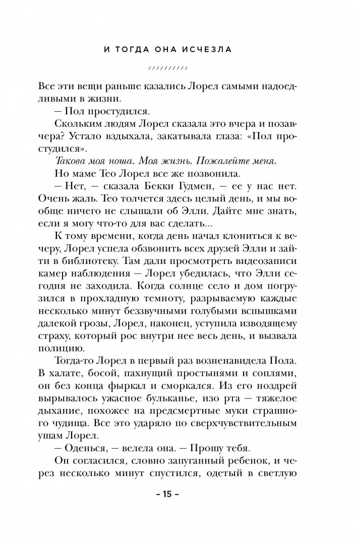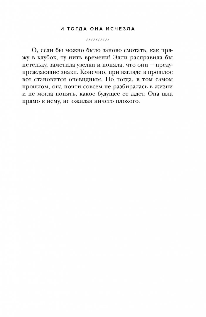 ОписаниеЕй было пятнадцать. Умница. Любимая дочь. Перед ней были открыты все двери, и целая жизнь, казалось, ждет впереди. Но потом Элли исчезла. Спустя десять лет Лорел все еще пытается разыскать дочь. Ее поиски приобретают новый смысл после двух неожиданных встреч. Первая - с мужчиной. Он красив, харизматичен, но один лишь его взгляд бросает Лорел в дрожь. Вторая - с ребенком. Девятилетней девочкой, которую Лорел едва не приняла за призрака. Точной копией пропавшей Элли. Но как это возможно?Ей было пятнадцать. Умница. Любимая дочь. Перед ней были открыты все двери, и целая жизнь, казалось, ждет впереди. Но потом Элли исчезла. Спустя десять лет Лорел все еще пытается разыскать дочь. Ее поиски приобретают новый смысл после двух неожиданных встреч. Первая - с мужчиной. Он красив, харизматичен, но один лишь его взгляд бросает Лорел в дрожь. Вторая - с ребенком. Девятилетней девочкой, которую Лорел едва не приняла за призрака. Точной копией пропавшей Элли. Но как это возможно?