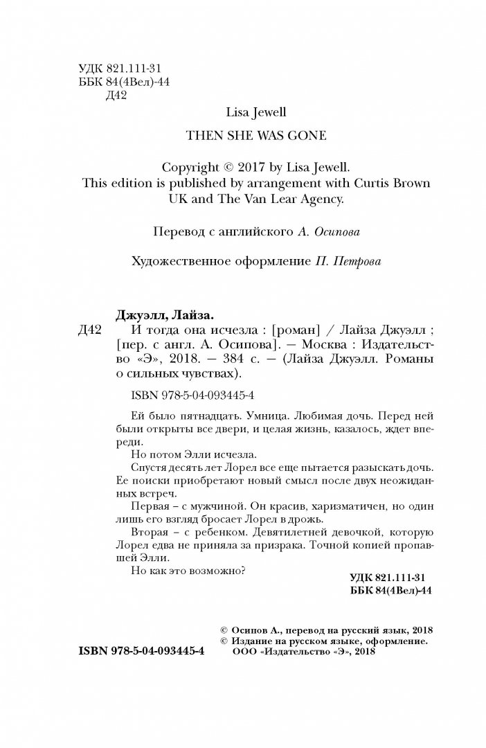 ---Лайза Джуэлл: И тогда она исчезлаРусская классическая и современная литератураДетектив. Остросюжетная литератураЗарубежная художественная литератураРусская художественная литератураФэнтезиДраматургияПоэзияПриключенияФантастикаЭпос и фольклорКлассическая прозаАфоризмыИсторическая прозаДетективыБасниСентиментальная прозаОтечественный боевикСовременная прозаМолодежная литератураЗарубежная классическая и современная литература