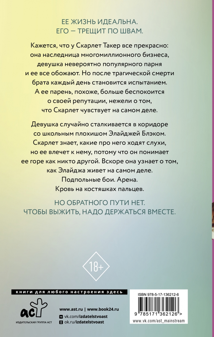 ОписаниеЕе жизнь идеальна. Его - трещит по швам.Кажется, что у Скарлет Такер все прекрасно: она наследница многомиллионного бизнеса, девушка невероятно популярного парня, и ее все обожают. Но после трагической смерти брата каждый день становится испытанием. А ее парень, похоже, больше беспокоится о своей репутации, нежели о том, что Скарлет чувствует на самом деле.Девушка случайно сталкивается в коридоре со школьным плохишом Элайджей Блэком. Скарлет знает, какие про него ходят слухи, но ее влечет к нему, потому что он понимает ее горе как никто другой. Вскоре она узнает о том, как он живет на самом деле. Подпольные бои. Арена. Кровь на костяшках пальцев.Но обратного пути нет. Чтобы выжить, надо держаться вместе.Ее жизнь идеальна. Его - трещит по швам.Кажется, что у Скарлет Такер все прекрасно: она наследница многомиллионного бизнеса, девушка невероятно популярного парня, и ее все обожают. Но после трагической смерти брата каждый день становится испытанием. А ее парень, похоже, больше беспокоится о своей репутации, нежели о том, что Скарлет чувствует на самом деле.Девушка случайно сталкивается в коридоре со школьным плохишом Элайджей Блэком. Скарлет знает, какие про него ходят слухи, но ее влечет к нему, потому что он понимает ее горе как никто другой. Вскоре она узнает о том, как он живет на самом деле. Подпольные бои. Арена. Кровь на костяшках пальцев.Но обратного пути нет. Чтобы выжить, надо держаться вместе.