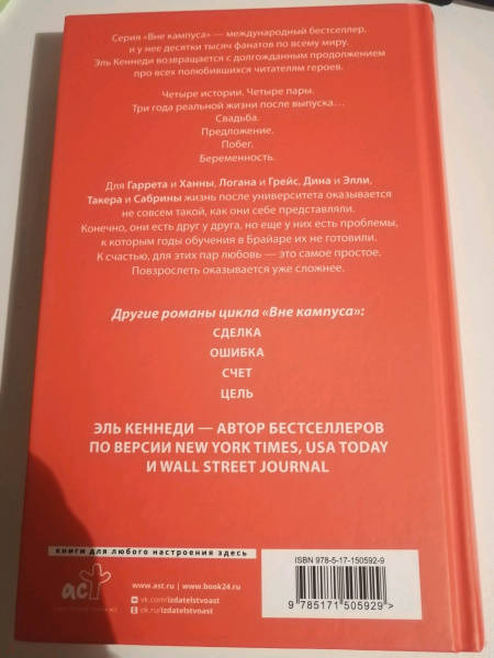ОписаниеЧетыре истории. Четыре пары. Три года реальной жизни после выпуска…Свадьба. Предложение.Побег.Беременность.Для Гаррета и Ханны, Логана и Грейс, Дина и Элли, Такера и Сабрины жизнь после университета оказывается не совсем такой, как они себе представляли. Конечно, они есть друг у друга, но еще у них есть проблемы, к которым годы обучения в Брайаре их не готовили. К счастью, для этих пар любовь - это самое простое. Повзрослеть оказывается уже сложнее.Университет Брайар остался позади. Впереди взрослая жизнь, и она накладывает отпечаток даже на самую крепкую любовь и бесстрашную влюбленность. Гаррет и Ханна, Логан и Грейс, Дин и Элли, Такер и Сабрина — четыре разные истории с одинаковым финалом в предыдущих книгах цикла «Вне кампуса». Все они нашли любовь и встретили хэппи-энд.