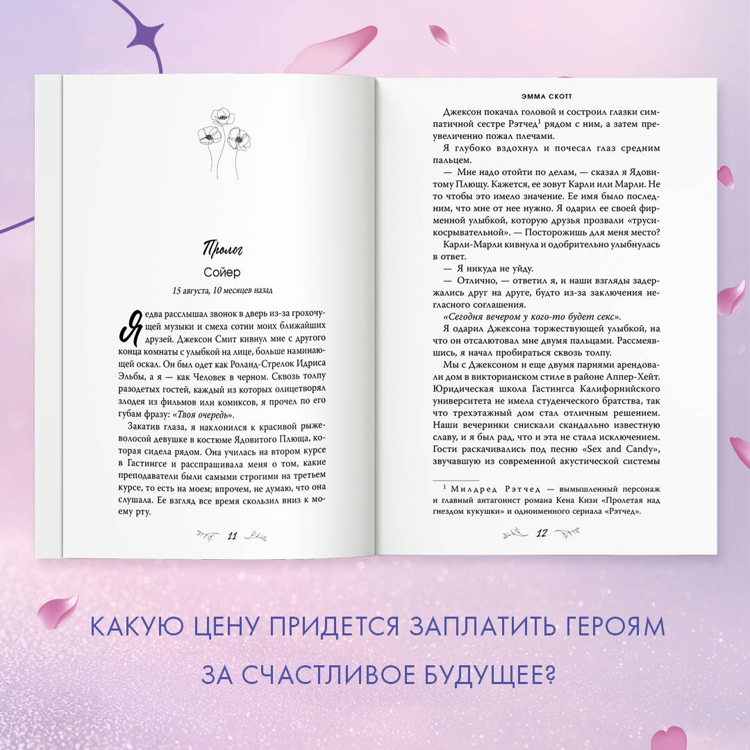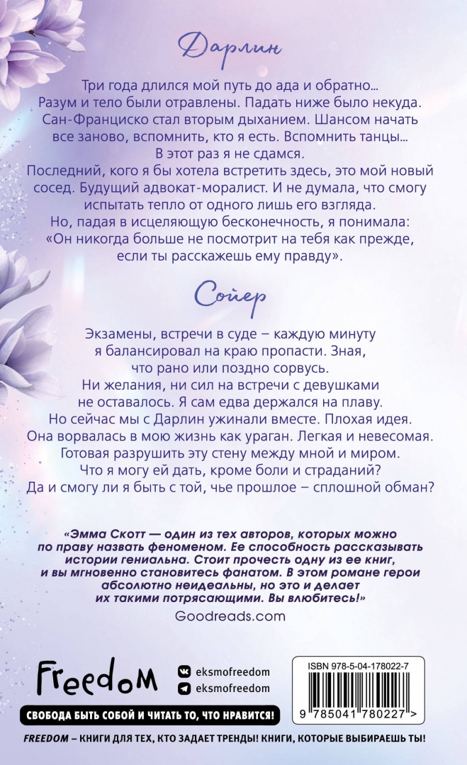 ОписаниеРомантические бестселлеры Эммы Скотт в новом, стильном оформлении. Удобный формат, мягкая обложка — все для того, чтобы не расставаться с любимыми героями. Уникальные яркие узоры на обрезе, блестящая фольга — собери всю коллекцию на своей полке! Книга про любовь танцовщицы со вторым шансом на жизнь и будущего адвоката-моралиста. Можно ли быть с той, чье прошлое — сплошной обман?Три года длился путь до ада и обратно… Разум и тело Дарлин были отравлены. Падать ниже было некуда. Сан-Франциско стал вторым дыханием. Шансом начать все заново, вспомнить, кто она есть. Вспомнить танцы… И в этот раз она не сдастся. Последний, кого она бы хотела встретить здесь, — это новый сосед. Будущий адвокат-моралист. Дарлин и не думала, что сможет испытать тепло от одного лишь его взгляда. Вот только будет ли он смотреть на нее как прежде, если узнает правду?Экзамены, встречи в суде — каждую минуту Сойер балансировал на краю пропасти. Зная, что рано или поздно сорвется. Ни желания, ни сил на встречи с девушками не оставалось: он сам едва держался на плаву. Дарлин ворвалась в его жизнь, как ураган. Легкая и невесомая. Готовая разрушить эту стену между мной и миром. Но что он может ей дать? Кроме боли и страданий.Книга о настоящих чувствах и их способности стать путеводной звездой. Испытайте сильные эмоции и проведите выходные в компании романтической художественной литературы! Лучший выбор для любителей книг романтики.С этой книгой ищут: любовные романы, freedom книги, грешник, сгорая дотла, среди тысячи слов, пять минут жизни, свет между нами, дотянуться до звезд, стань моим завтра, зажечь небеса, young adultСвернутьРомантические бестселлеры Эммы Скотт в новом, стильном оформлении. Удобный формат, мягкая обложка — все для того, чтобы не расставаться с любимыми героями. Уникальные яркие узоры на обрезе, блестящая фольга — собери всю коллекцию на своей полке! Книга про любовь танцовщицы со вторым шансом на жизнь и будущего адвоката-моралиста. Можно ли быть с той, чье прошлое — сплошной обман?Три года длился путь до ада и обратно… Разум и тело Дарлин были отравлены. Падать ниже было некуда. Сан-Франциско стал вторым дыханием. Шансом начать все заново, вспомнить, кто она есть. Вспомнить танцы… И в этот раз она не сдастся. Последний, кого она бы хотела встретить здесь, — это новый сосед. Будущий адвокат-моралист. Дарлин и не думала, что сможет испытать тепло от одного лишь его взгляда. Вот только будет ли он смотреть на нее как прежде, если узнает правду?Экзамены, встречи в суде — каждую минуту Сойер балансировал на краю пропасти. Зная, что рано или поздно сорвется. Ни желания, ни сил на встречи с девушками не оставалось: он сам едва держался на плаву. Дарлин ворвалась в его жизнь, как ураган. Легкая и невесомая. Готовая разрушить эту стену между мной и миром. Но что он может ей дать? Кроме боли и страданий.Книга о настоящих чувствах и их способности стать путеводной звездой. Испытайте сильные эмоции и проведите выходные в компании романтической художественной литературы! Лучший выбор для любителей книг романтики.С этой книгой ищут: любовные романы, freedom книги, грешник, сгорая дотла, среди тысячи слов, пять минут жизни, свет между нами, дотянуться до звезд, стань моим завтра, зажечь небеса, young adultСвернутьСвернуть