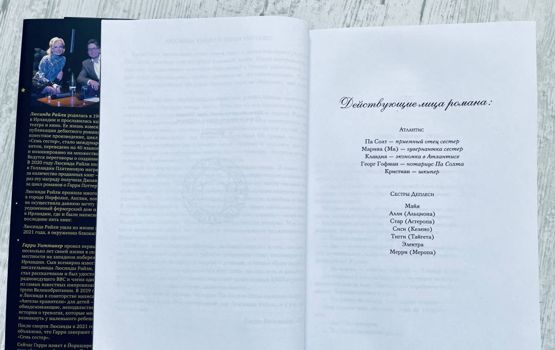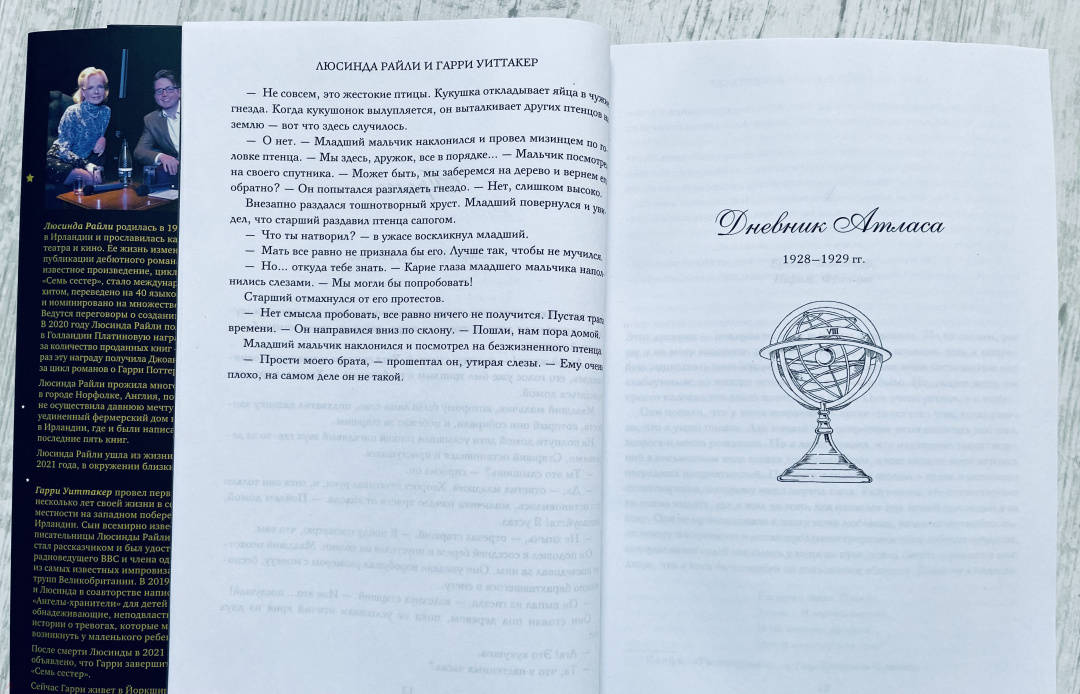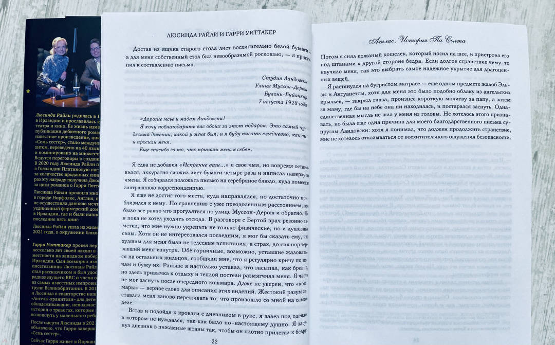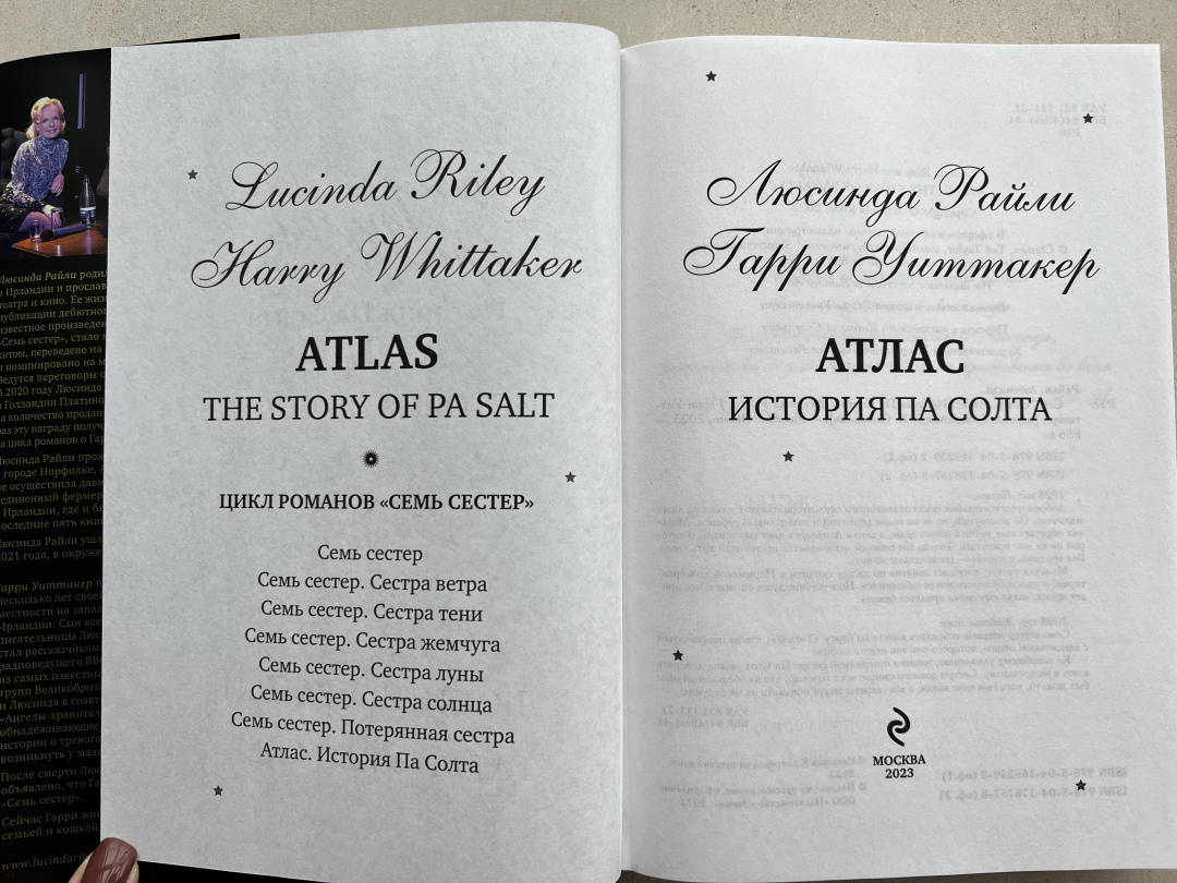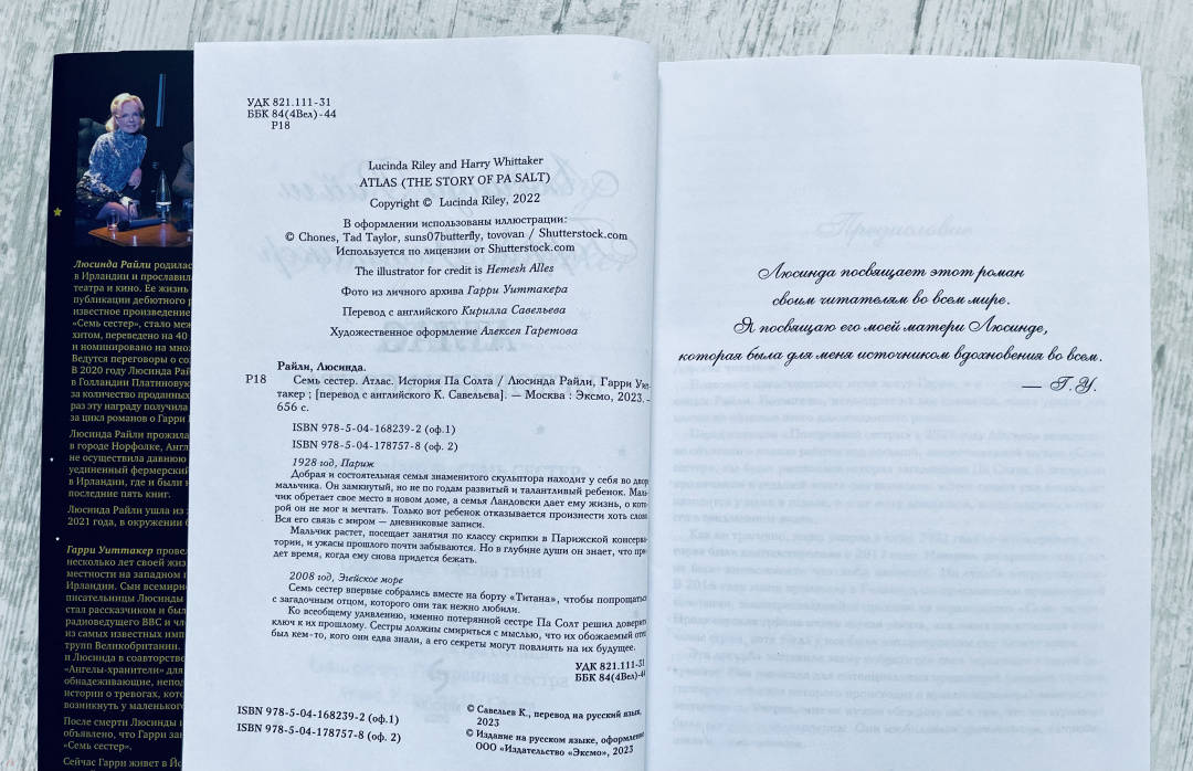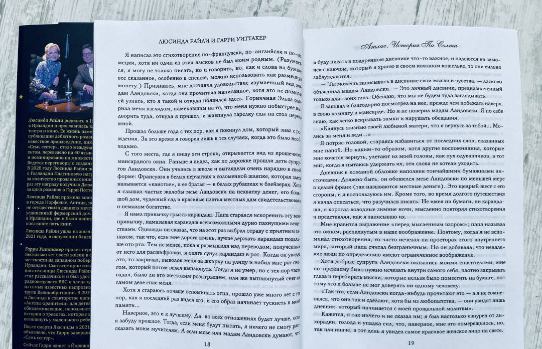 ОписаниеФинал легендарного цикла "Семь сестер"! "Атлас. История Па Солта" - восьмая и заключительная часть знаменитой саги Люсинды Райли о сестрах, носящих имена в честь созвездия Плеяд. 1928 год, Париж Добрая и состоятельная семья знаменитого скульптора находит у себя во дворе мальчика. Он замкнутый, но не по годам развитый и талантливый ребенок. Мальчик обретает свое место в новом доме, а семья Ландовски дает ему жизнь, о которой он и не мог мечтать. Только вот ребенок отказывается произнести хоть слово. Вся его связь с миром - дневниковые записи. Мальчик растет, посещает занятия по классу скрипки в Парижской консерватории, и ужасы прошлого почти забываются. Но в глубине души он знает, что придет время, когда ему снова придется бежать. 2008 год, Эгейское море Семь сестер впервые собрались вместе на борту "Титана", чтобы попрощаться с загадочным отцом, которого они так нежно любили. Ко всеобщему удивлению, именно потерянной сестре Па Солт решил доверить ключ к их прошлому. Сестры должны смириться с мыслью, что их обожаемый отец был кем-то, кого они едва знали, а его секреты могут повлиять на их будущее. "Душераздирающий, воодушевляющий и совершенно захватывающий роман. Цикл "Семь сестер" - это пик мастерства Люсинды Райли. Она - волшебная рассказчица, создающая персонажей, в которых мы влюбляемся, и они остаются с нами еще очень долго после того, как мы заканчиваем читать". - Люси Фоли "Эпическая история о любви, потерях и открытиях". - My Weekly "Атмосферное, эмоциональное, многослойное произведение". - Grazia "Охватывающий разные континенты и десятилетия, это убедительный роман эпического масштаба". - Sunday Express "Поистине волшебное приключение". - Woman's World MagazineСвернутьФинал легендарного цикла "Семь сестер"! "Атлас. История Па Солта" - восьмая и заключительная часть знаменитой саги Люсинды Райли о сестрах, носящих имена в честь созвездия Плеяд. 1928 год, Париж Добрая и состоятельная семья знаменитого скульптора находит у себя во дворе мальчика. Он замкнутый, но не по годам развитый и талантливый ребенок. Мальчик обретает свое место в новом доме, а семья Ландовски дает ему жизнь, о которой он и не мог мечтать. Только вот ребенок отказывается произнести хоть слово. Вся его связь с миром - дневниковые записи. Мальчик растет, посещает занятия по классу скрипки в Парижской консерватории, и ужасы прошлого почти забываются. Но в глубине души он знает, что придет время, когда ему снова придется бежать. 2008 год, Эгейское море Семь сестер впервые собрались вместе на борту "Титана", чтобы попрощаться с загадочным отцом, которого они так нежно любили. Ко всеобщему удивлению, именно потерянной сестре Па Солт решил доверить ключ к их прошлому. Сестры должны смириться с мыслью, что их обожаемый отец был кем-то, кого они едва знали, а его секреты могут повлиять на их будущее. "Душераздирающий, воодушевляющий и совершенно захватывающий роман. Цикл "Семь сестер" - это пик мастерства Люсинды Райли. Она - волшебная рассказчица, создающая персонажей, в которых мы влюбляемся, и они остаются с нами еще очень долго после того, как мы заканчиваем читать". - Люси Фоли "Эпическая история о любви, потерях и открытиях". - My Weekly "Атмосферное, эмоциональное, многослойное произведение". - Grazia "Охватывающий разные континенты и десятилетия, это убедительный роман эпического масштаба". - Sunday Express "Поистине вол