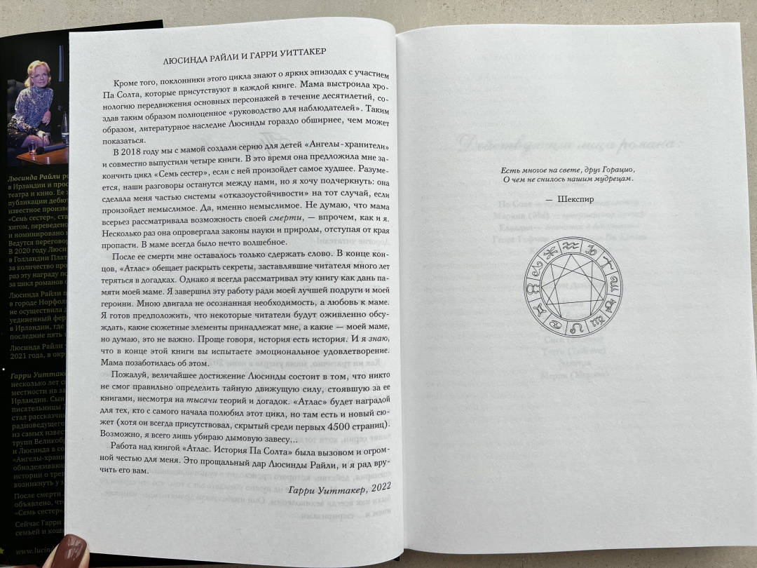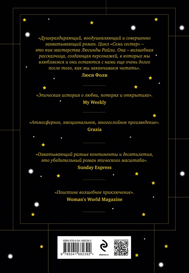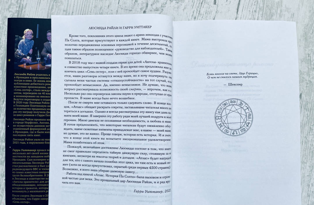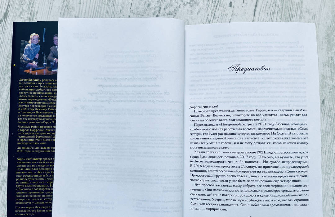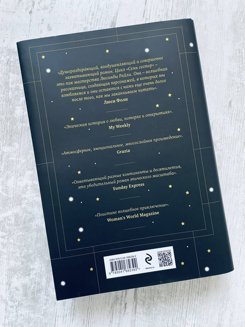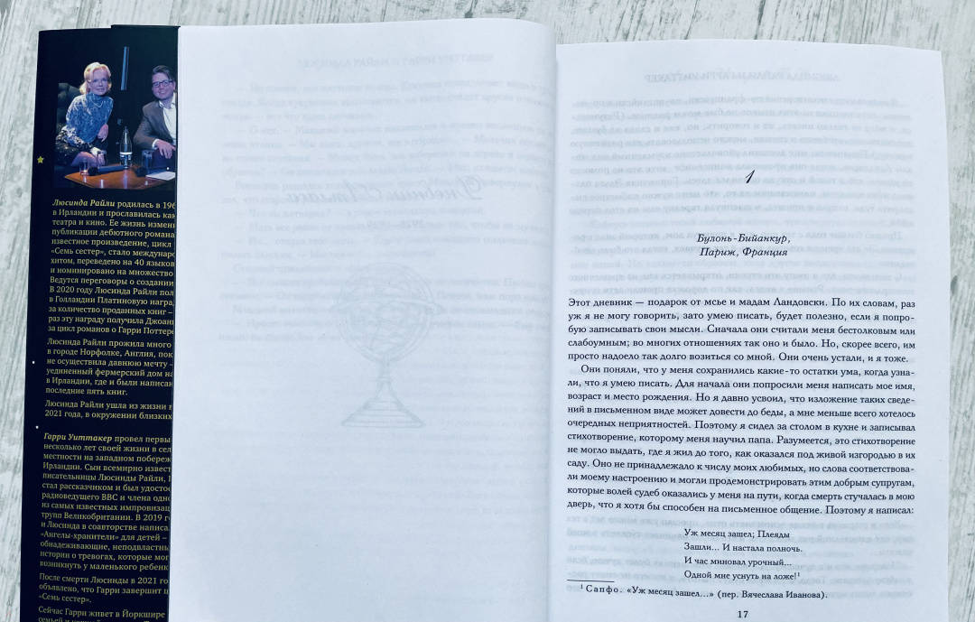 ОписаниеФинал легендарного цикла "Семь сестер"! "Атлас. История Па Солта" - восьмая и заключительная часть знаменитой саги Люсинды Райли о сестрах, носящих имена в честь созвездия Плеяд. 1928 год, Париж Добрая и состоятельная семья знаменитого скульптора находит у себя во дворе мальчика. Он замкнутый, но не по годам развитый и талантливый ребенок. Мальчик обретает свое место в новом доме, а семья Ландовски дает ему жизнь, о которой он и не мог мечтать. Только вот ребенок отказывается произнести хоть слово. Вся его связь с миром - дневниковые записи. Мальчик растет, посещает занятия по классу скрипки в Парижской консерватории, и ужасы прошлого почти забываются. Но в глубине души он знает, что придет время, когда ему снова придется бежать. 2008 год, Эгейское море Семь сестер впервые собрались вместе на борту "Титана", чтобы попрощаться с загадочным отцом, которого они так нежно любили. Ко всеобщему удивлению, именно потерянной сестре Па Солт решил доверить ключ к их прошлому. Сестры должны смириться с мыслью, что их обожаемый отец был кем-то, кого они едва знали, а его секреты могут повлиять на их будущее. "Душераздирающий, воодушевляющий и совершенно захватывающий роман. Цикл "Семь сестер" - это пик мастерства Люсинды Райли. Она - волшебная рассказчица, создающая персонажей, в которых мы влюбляемся, и они остаются с нами еще очень долго после того, как мы заканчиваем читать". - Люси Фоли "Эпическая история о любви, потерях и открытиях". - My Weekly "Атмосферное, эмоциональное, многослойное произведение". - Grazia "Охватывающий разные континенты и десятилетия, это убедительный роман эпического масштаба". - Sunday Express "Поистине волшебное приключение". - Woman's World MagazineСвернутьФинал легендарного цикла "Семь сестер"! "Атлас. История Па Солта" - восьмая и заключительная часть знаменитой саги Люсинды Райли о сестрах, носящих имена в честь созвездия Плеяд. 1928 год, Париж Добрая и состоятельная семья знаменитого скульптора находит у себя во дворе мальчика. Он замкнутый, но не по годам развитый и талантливый ребенок. Мальчик обретает свое место в новом доме, а семья Ландовски дает ему жизнь, о которой он и не мог мечтать. Только вот ребенок отказывается произнести хоть слово. Вся его связь с миром - дневниковые записи. Мальчик растет, посещает занятия по классу скрипки в Парижской консерватории, и ужасы прошлого почти забываются. Но в глубине души он знает, что придет время, когда ему снова придется бежать. 2008 год, Эгейское море Семь сестер впервые собрались вместе на борту "Титана", чтобы попрощаться с загадочным отцом, которого они так нежно любили. Ко всеобщему удивлению, именно потерянной сестре Па Солт решил доверить ключ к их прошлому. Сестры должны смириться с мыслью, что их обожаемый отец был кем-то, кого они едва знали, а его секреты могут повлиять на их будущее. "Душераздирающий, воодушевляющий и совершенно захватывающий роман. Цикл "Семь сестер" - это пик мастерства Люсинды Райли. Она - волшебная рассказчица, создающая персонажей, в которых мы влюбляемся, и они остаются с нами еще очень долго после того, как мы заканчиваем читать". - Люси Фоли "Эпическая история о любви, потерях и открытиях". - My Weekly "Атмосферное, эмоциональное, многослойное произведение". - Grazia "Охватывающий разные континенты и десятилетия, это убедительный роман эпического масштаба". - Sunday Express "Поистине вол