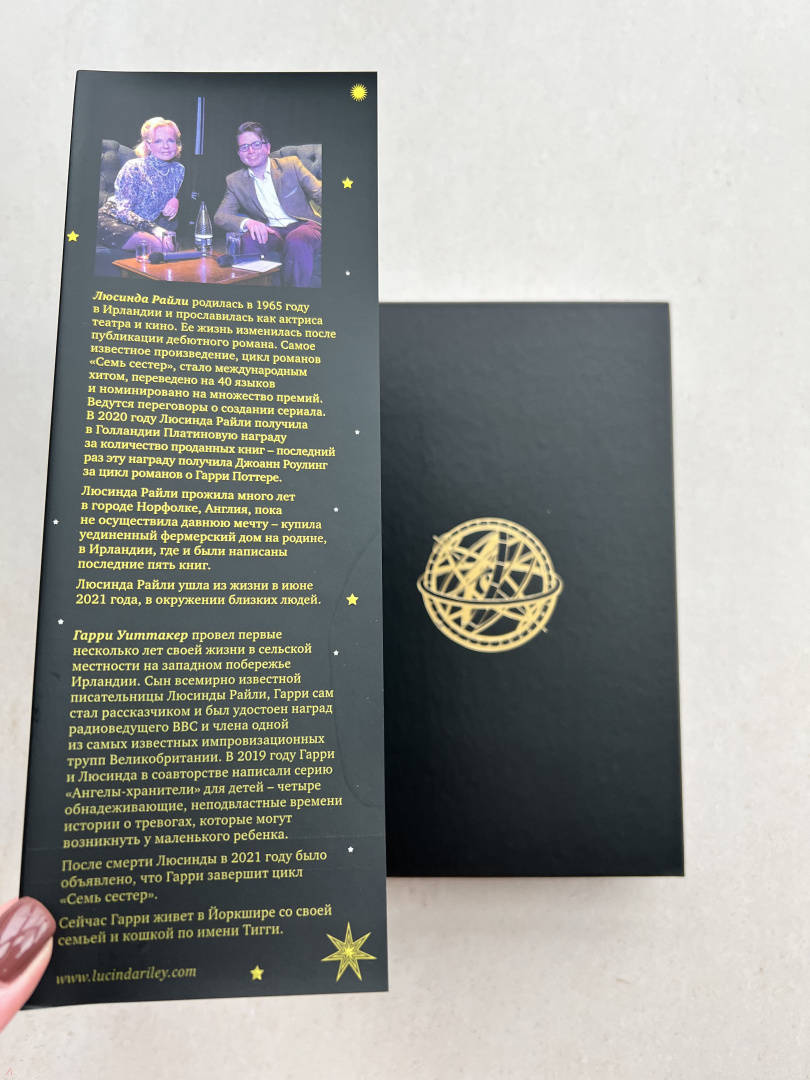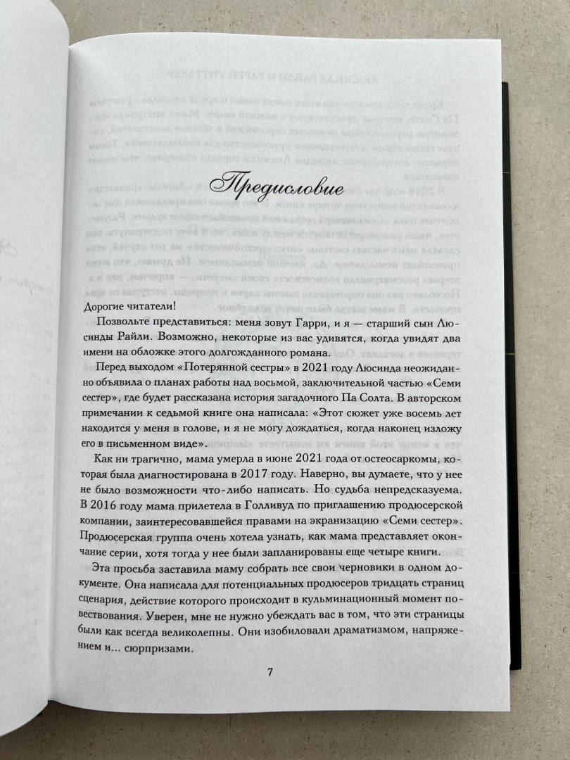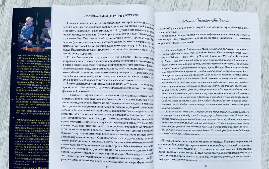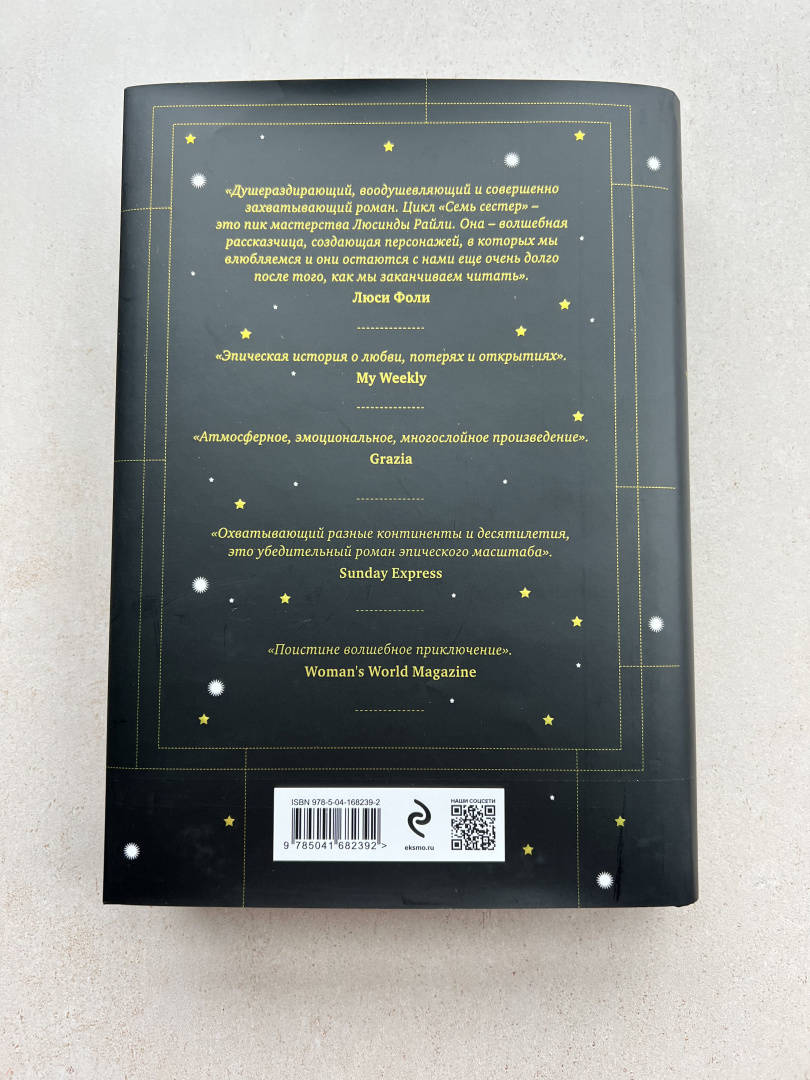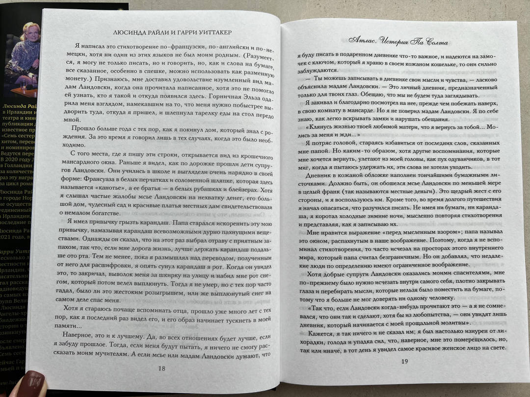 ОписаниеФинал легендарного цикла "Семь сестер"! "Атлас. История Па Солта" - восьмая и заключительная часть знаменитой саги Люсинды Райли о сестрах, носящих имена в честь созвездия Плеяд. 1928 год, Париж Добрая и состоятельная семья знаменитого скульптора находит у себя во дворе мальчика. Он замкнутый, но не по годам развитый и талантливый ребенок. Мальчик обретает свое место в новом доме, а семья Ландовски дает ему жизнь, о которой он и не мог мечтать. Только вот ребенок отказывается произнести хоть слово. Вся его связь с миром - дневниковые записи. Мальчик растет, посещает занятия по классу скрипки в Парижской консерватории, и ужасы прошлого почти забываются. Но в глубине души он знает, что придет время, когда ему снова придется бежать. 2008 год, Эгейское море Семь сестер впервые собрались вместе на борту "Титана", чтобы попрощаться с загадочным отцом, которого они так нежно любили. Ко всеобщему удивлению, именно потерянной сестре Па Солт решил доверить ключ к их прошлому. Сестры должны смириться с мыслью, что их обожаемый отец был кем-то, кого они едва знали, а его секреты могут повлиять на их будущее. "Душераздирающий, воодушевляющий и совершенно захватывающий роман. Цикл "Семь сестер" - это пик мастерства Люсинды Райли. Она - волшебная рассказчица, создающая персонажей, в которых мы влюбляемся, и они остаются с нами еще очень долго после того, как мы заканчиваем читать". - Люси Фоли "Эпическая история о любви, потерях и открытиях". - My Weekly "Атмосферное, эмоциональное, многослойное произведение". - Grazia "Охватывающий разные континенты и десятилетия, это убедительный роман эпического масштаба". - Sunday Express "Поистине волшебное приключение". - Woman's World MagazineСвернутьФинал легендарного цикла "Семь сестер"! "Атлас. История Па Солта" - восьмая и заключительная часть знаменитой саги Люсинды Райли о сестрах, носящих имена в честь созвездия Плеяд. 1928 год, Париж Добрая и состоятельная семья знаменитого скульптора находит у себя во дворе мальчика. Он замкнутый, но не по годам развитый и талантливый ребенок. Мальчик обретает свое место в новом доме, а семья Ландовски дает ему жизнь, о которой он и не мог мечтать. Только вот ребенок отказывается произнести хоть слово. Вся его связь с миром - дневниковые записи. Мальчик растет, посещает занятия по классу скрипки в Парижской консерватории, и ужасы прошлого почти забываются. Но в глубине души он знает, что придет время, когда ему снова придется бежать. 2008 год, Эгейское море Семь сестер впервые собрались вместе на борту "Титана", чтобы попрощаться с загадочным отцом, которого они так нежно любили. Ко всеобщему удивлению, именно потерянной сестре Па Солт решил доверить ключ к их прошлому. Сестры должны смириться с мыслью, что их обожаемый отец был кем-то, кого они едва знали, а его секреты могут повлиять на их будущее. "Душераздирающий, воодушевляющий и совершенно захватывающий роман. Цикл "Семь сестер" - это пик мастерства Люсинды Райли. Она - волшебная рассказчица, создающая персонажей, в которых мы влюбляемся, и они остаются с нами еще очень долго после того, как мы заканчиваем читать". - Люси Фоли "Эпическая история о любви, потерях и открытиях". - My Weekly "Атмосферное, эмоциональное, многослойное произведение". - Grazia "Охватывающий разные континенты и десятилетия, это убедительный роман эпического масштаба". - Sunday Express "Поистине вол