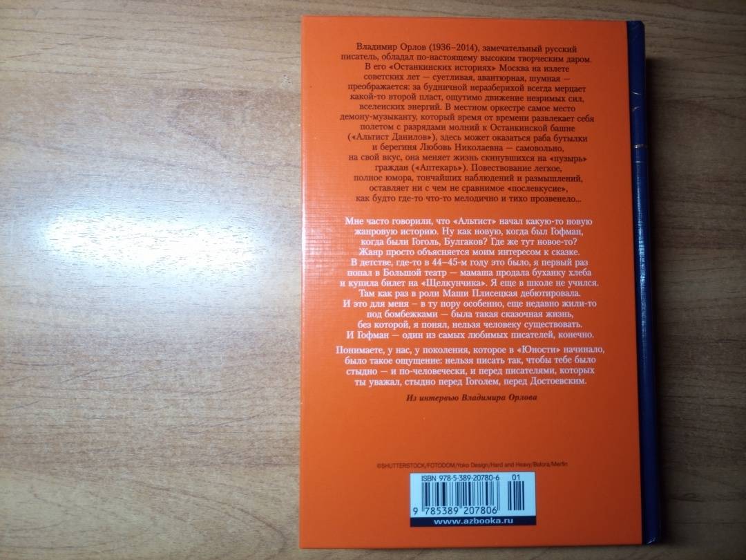 ОписаниеВладимир Орлов (1936–2014), замечательный русский писатель, обладал по-настоящему высоким творческим даром. В его «Останкинских историях» Москва на излете советских лет — суетливая, авантюрная, шумная — преображается: за будничной неразберихой всегда мерцает какой-то второй пласт, ощутимо движение незримых сил, вселенских энергий. В местном оркестре самое место демону-музыканту, который время от времени развлекает себя полетом с разрядами молний к Останкинской башне («Альтист Данилов»), здесь может оказаться раба бутылки и берегиня Любовь Николаевна — самовольно, на свой вкус, она меняет жизнь скинувшихся на «пузырь» граждан («Аптекарь»). Повествование легкое, полное юмора, тончайших наблюдений и размышлений, оставляет ни с чем не сравнимое «послевкусие», как будто где-то что-то мелодично и тихо прозвенело…Владимир Орлов (1936–2014), замечательный русский писатель, обладал по-настоящему высоким творческим даром. В его «Останкинских историях» Москва на излете советских лет — суетливая, авантюрная, шумная — преображается: за будничной неразберихой всегда мерцает какой-то второй пласт, ощутимо движение незримых сил, вселенских энергий. В местном оркестре самое место демону-музыканту, который время от времени развлекает себя полетом с разрядами молний к Останкинской башне («Альтист Данилов»), здесь может оказаться раба бутылки и берегиня Любовь Николаевна — самовольно, на свой вкус, она меняет жизнь скинувшихся на «пузырь» граждан («Аптекарь»). Повествование легкое, полное юмора, тончайших наблюдений и размышлений, оставляет ни с чем не сравнимое «послевкусие», как будто где-то что-то мелодично и тихо прозвенело…